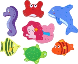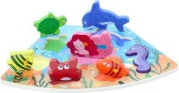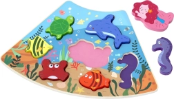 Entdecken Sie die Magie des Ozeans mit einer robusten Holzplatte und 7 verschiedenen Teilen – Schildkröte, Delfin, Meerjungfrau, Seepferdchen, Krabbe und weitere Fische. Dank der dicken, glatten Teile liegt das Puzzle auch den Kleinsten gut in der Hand und hilft ihnen, Formenwahrnehmung und Geduld zu trainieren.