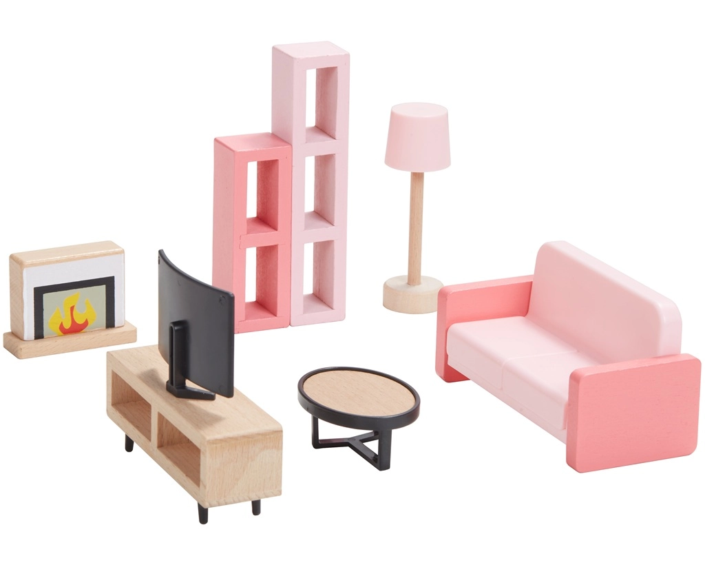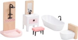 Dieses vielseitige Puppenhaus-Möbelset bietet alles, was Kinder brauchen, um ein gemütliches Zuhause für ihre Figuren zu gestalten. Enthalten ist die Ausstattung für Schlafzimmer, Küche, Wohnzimmer, Bad und Kinderzimmer in einer harmonischen Kombination aus naturbelassenem Holz und zarten Rosé-Akzenten. Dazu kommt die ganze Familie mit biegsamen Gliedern für authentische Szenen und Rollenspiele.