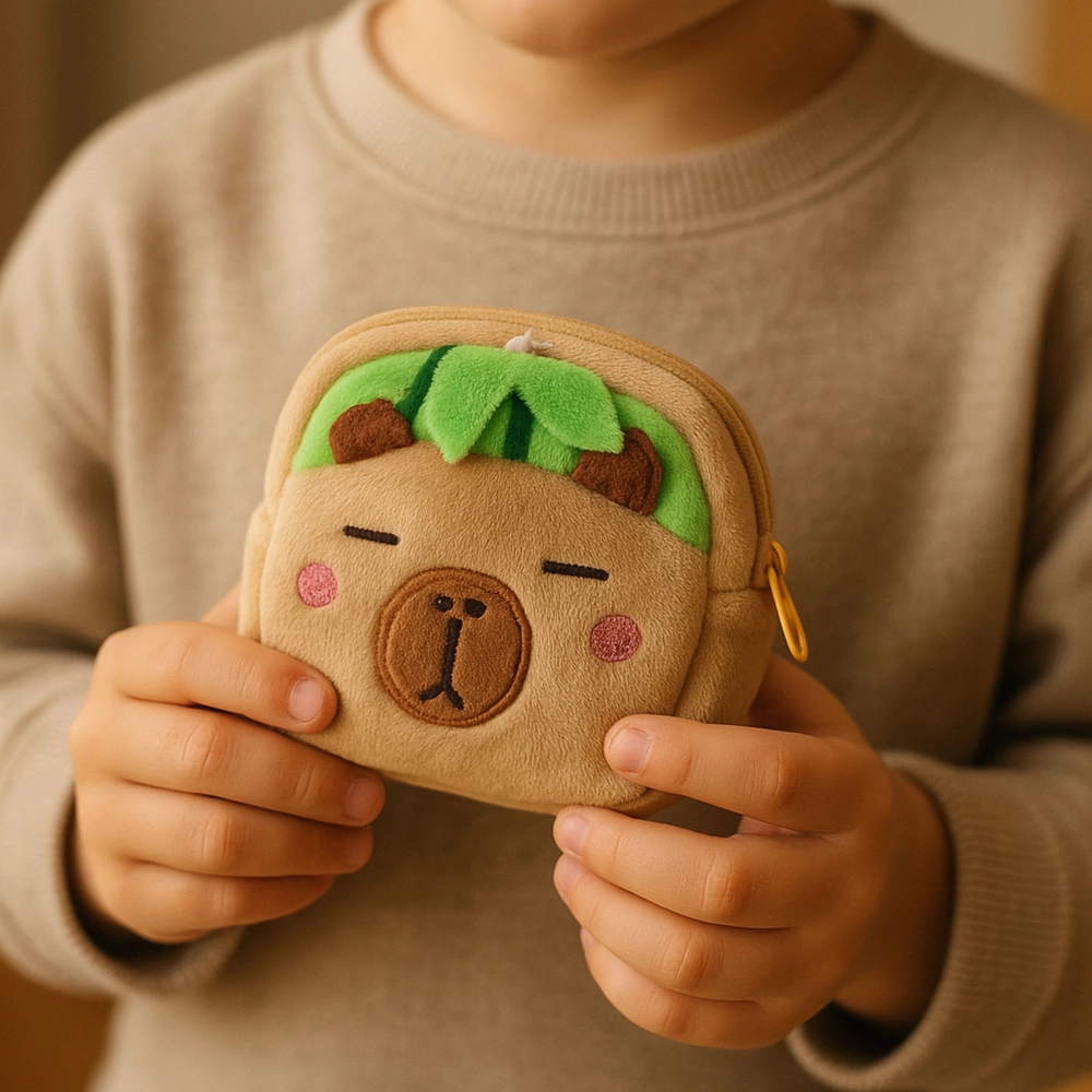 Diese Plüsch-Geldbörse – Kapybara begeistert Kinder und Liebhaber niedlicher Accessoires. Das weiche Material fühlt sich angenehm an, der Reißverschluss bewahrt Münzen, Schlüssel und kleines Zubehör sicher auf und dank des praktischen Clips ist die Geldbörse immer zur Hand.