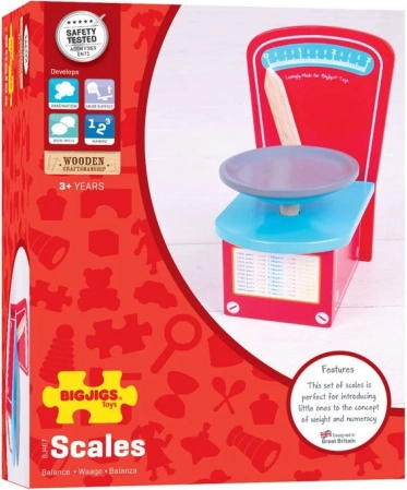 Diese vollwertige Holzwaage von Bigjigs Toys ist die ideale Ergänzung für die Kinderküche. Beim Spielen üben Kinder Rechnen, Gewichtsschätzung sowie soziale Kompetenzen beim gemeinsamen Spiel.