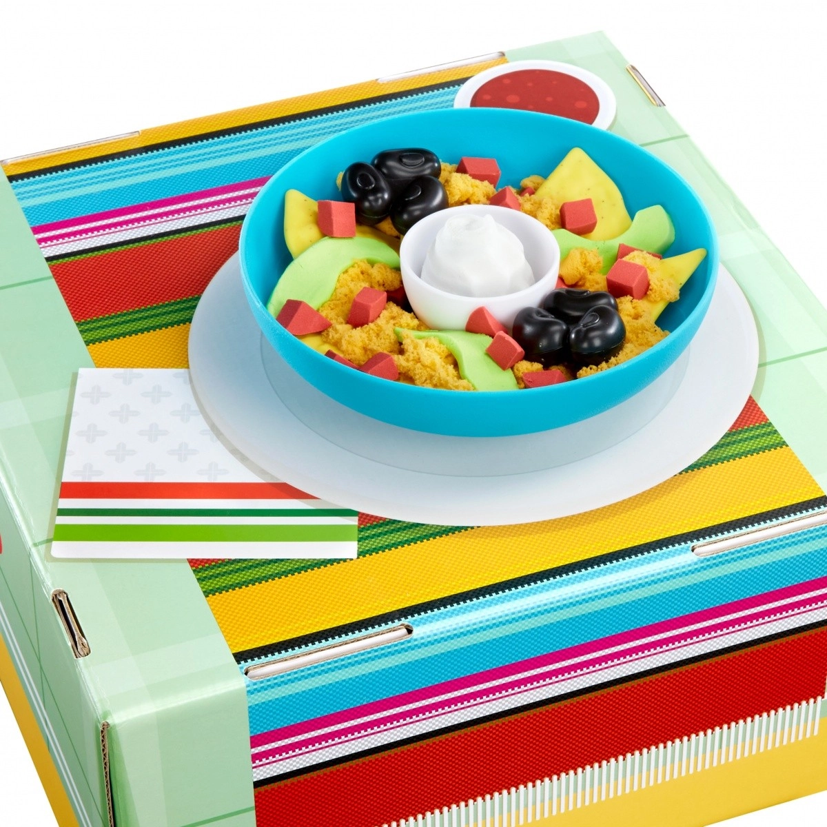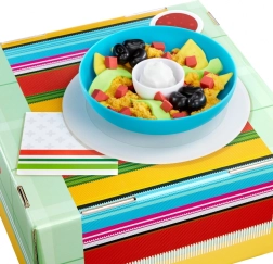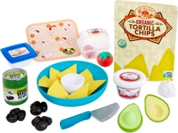 Dieses farbenfrohe Set zur Zubereitung von „Nachos“ bringt Spielspaß in die Kinderküche und das Spielzimmer. Enthalten sind eine Schüssel, ein Teller und eine große Auswahl an Kunststoff-Zutaten – „Tortilla-Chips“, Avocado, Cherrytomaten, schwarze Bohnen, Käse sowie „saure Sahne“. Kinder üben so spielend fantasievolles Kochen, Servieren und gesellschaftliches Spiel am Tisch.