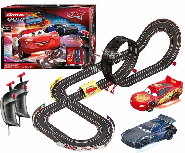 Die CARRERA GO!!! Cars Neon Nights Rennbahn bietet actionreiche Rennen im Maßstab 1:43 mit zwei lizenzierten Fahrzeugen: Lightning McQueen und Jackson Storm. Dank Turbo-Taste an den Controllern erleben Sie blitzartige Beschleunigung, während Looping, Verengung und Kreuzung Ihre Fahrkünste auf die Probe stellen. Das einzigartige Click-System ermöglicht einen schnellen Auf- und Abbau der Strecke.