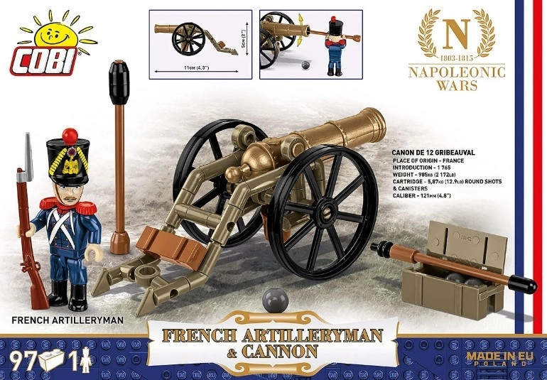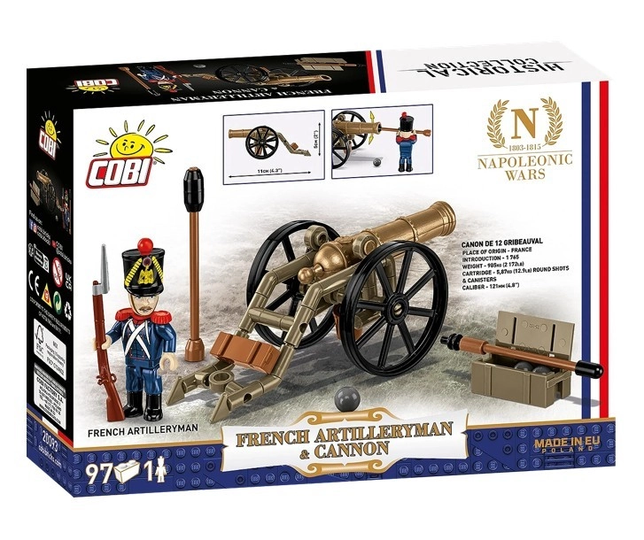 Entdecken Sie die Schlagkraft der napoleonischen Artillerie mit dem authentischen Modell der 12-Pfünder-Gribeauval-Kanone und der Figur eines französischen Kanoniers in dunkelblauer Uniform. Der Bausatz bietet realistische Details einschließlich Reinigungsstange, Munition und Holzkiste, sodass Sie mühelos eine authentische historische Szene gestalten können.