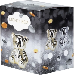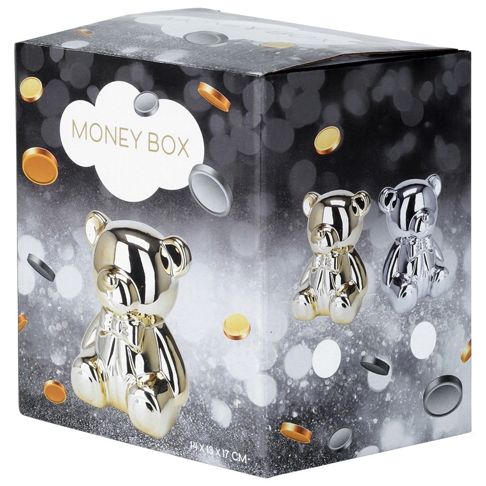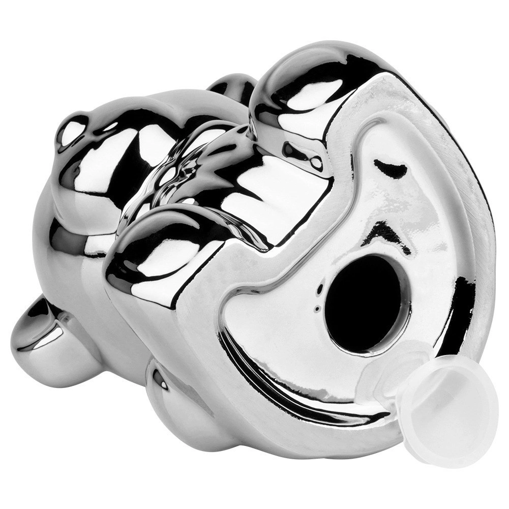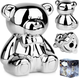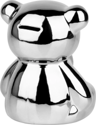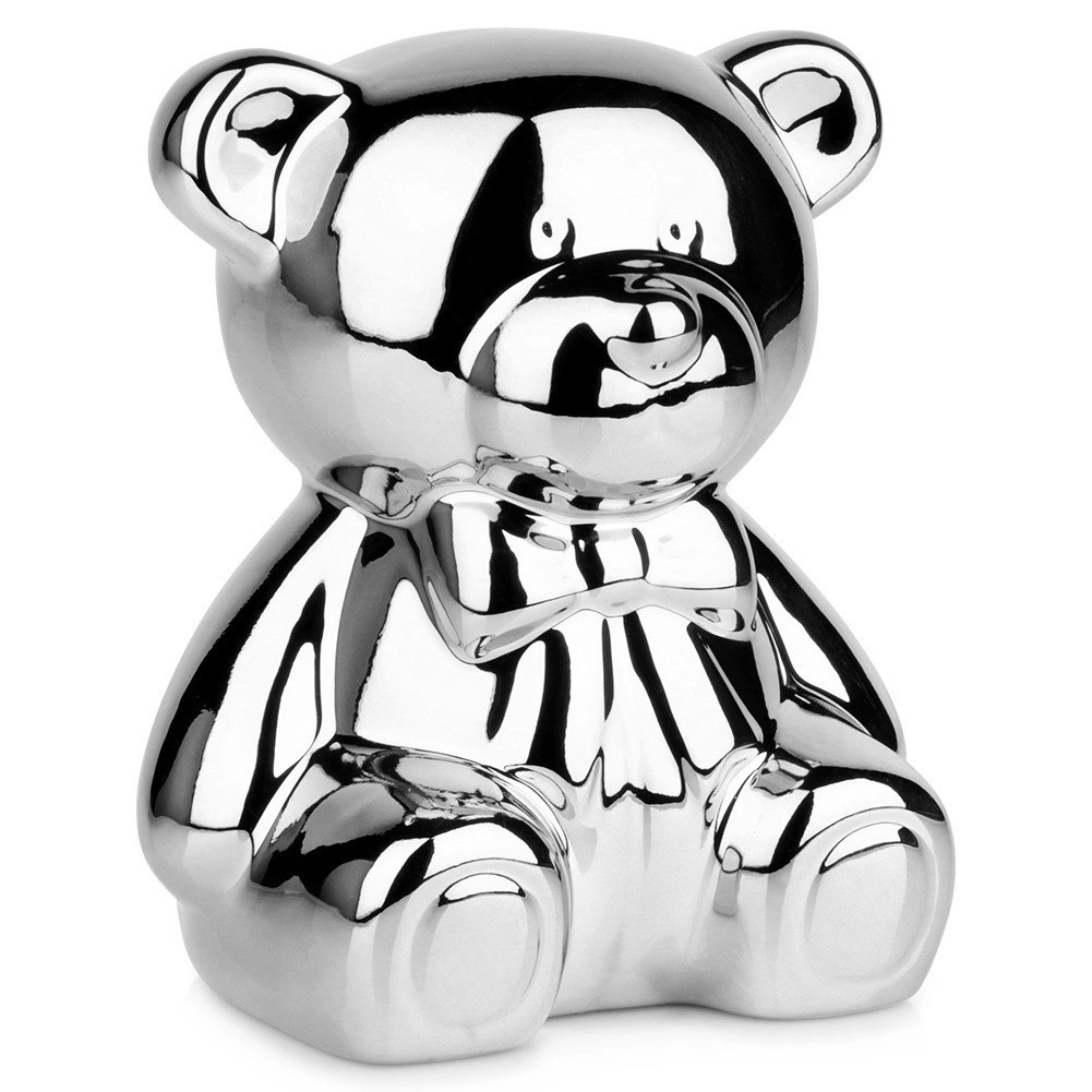 Diese silberne Keramik-Spardose in Bärenform vereint modernes Glamour-Design mit praktischem Nutzen. Der Spiegelglanz verleiht dem Interieur einen Hauch von Luxus und motiviert zugleich zum regelmäßigen Sparen von Münzen und Scheinen.