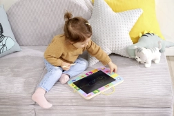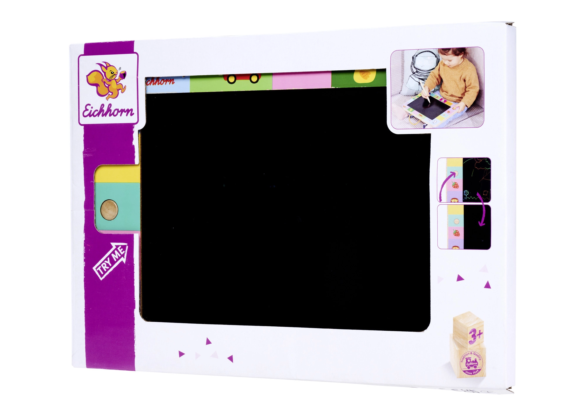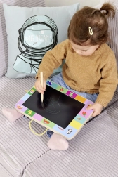Die schwarze Zeichenfläche und der Stylus ermöglichen Kindern zu zeichnen, zu schreiben und Formen zu üben. Mit einem Knopfdruck wird alles gelöscht und es geht von vorn los.
