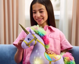 Das Plüscheinhorn WILDSTAR ist von der beliebten Serie UNICORN ACADEMY inspiriert. Es besteht aus weichem lila Plüsch mit hellen „magischen“ Motiven, hat ein glitzerndes goldenes Horn und Hufe, eine regenbogenfarbene Mähne und einen Schweif sowie ein elegantes Zaumzeug. Bei Berührung der Stirn leuchten das Horn und die dekorativen Elemente am Körper in warmem LED-Licht auf, begleitet von einem magischen Klang.