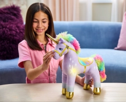 Das Horn und die Ziermotive am Körper leuchten bei Berührung in einem warmen LED-Licht und werden von einem sanften Klang begleitet – ideal für Gutenachtgeschichten und magische Spiele.