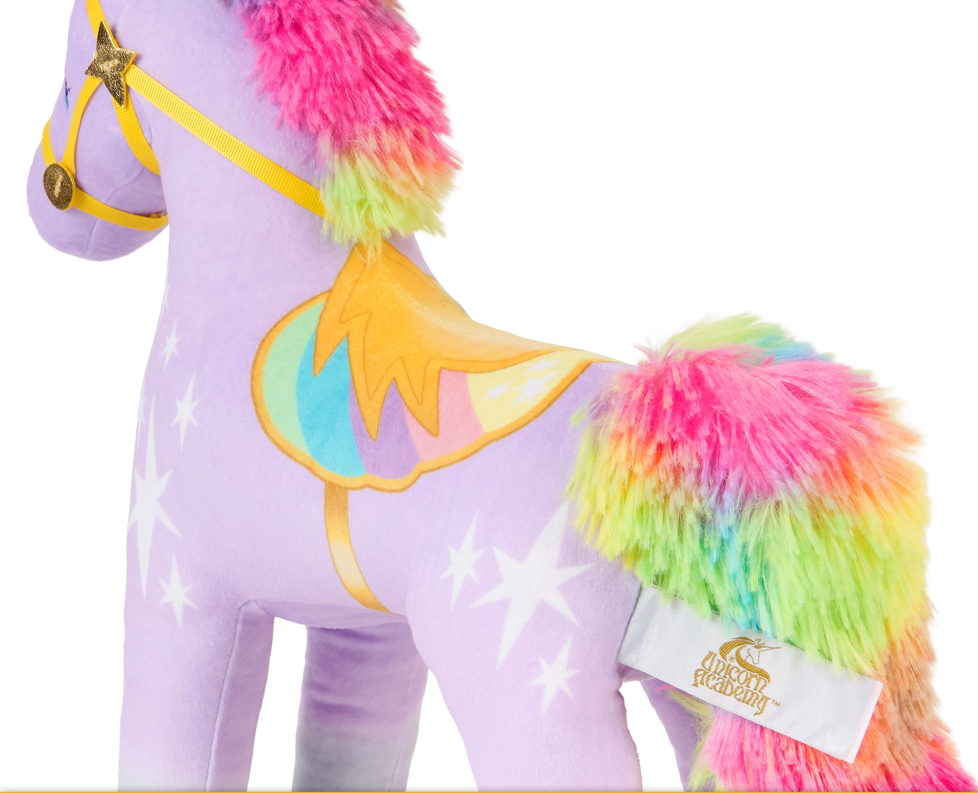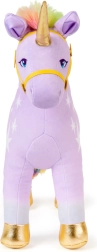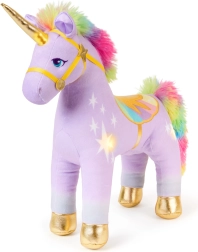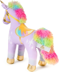 Der kuschelweiche lila Stoff, die regenbogenfarbene Mähne und der Schweif sowie goldene Akzente sorgen für einen hochwertigen Look und ein angenehmes Gefühl beim Kuscheln.