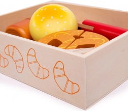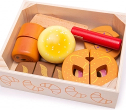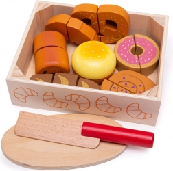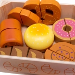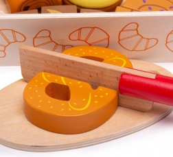 Jedes Gebäckstück ist mit Klettverschluss verbunden und kann mit dem Holzmesser für ein realistisches Spiel geschnitten werden.