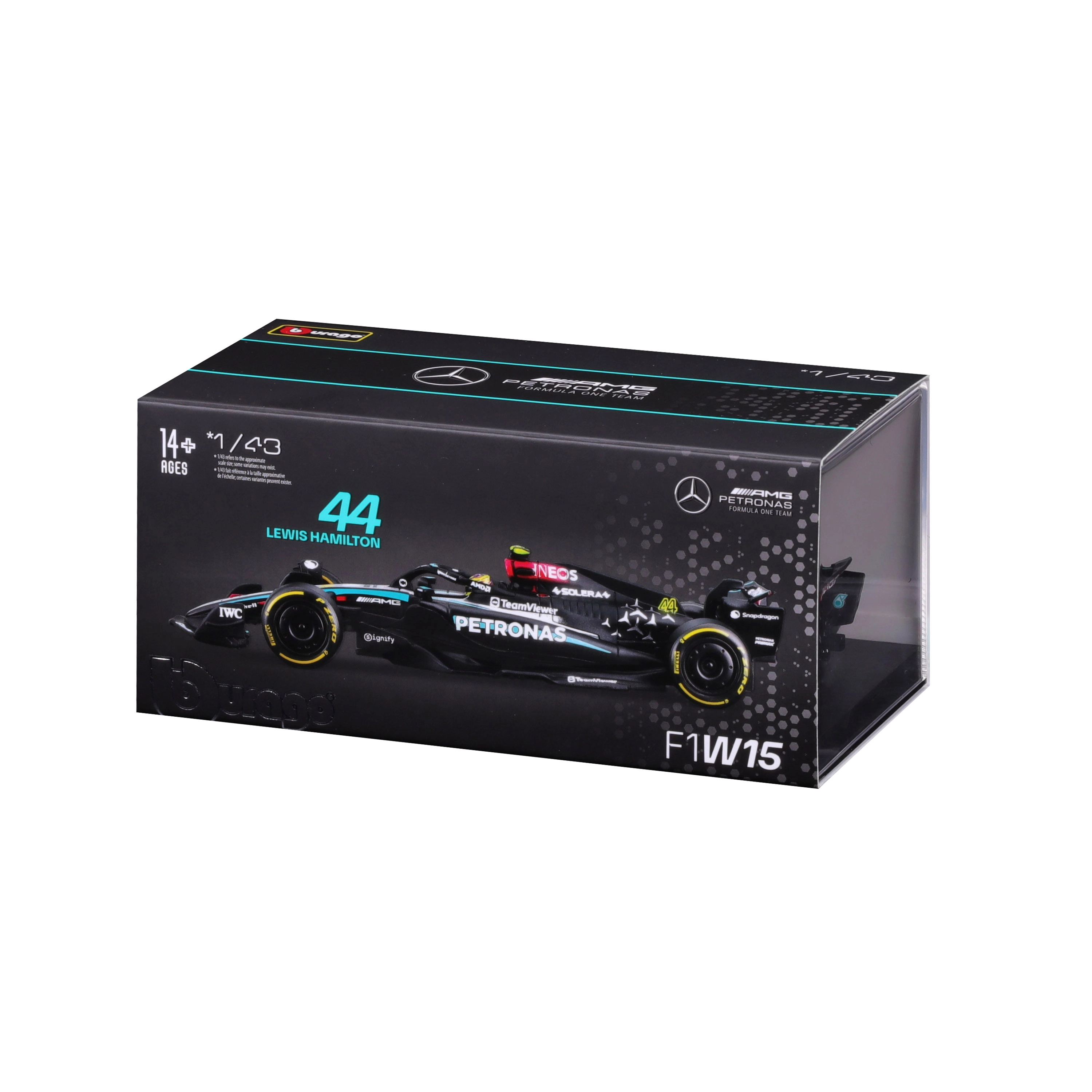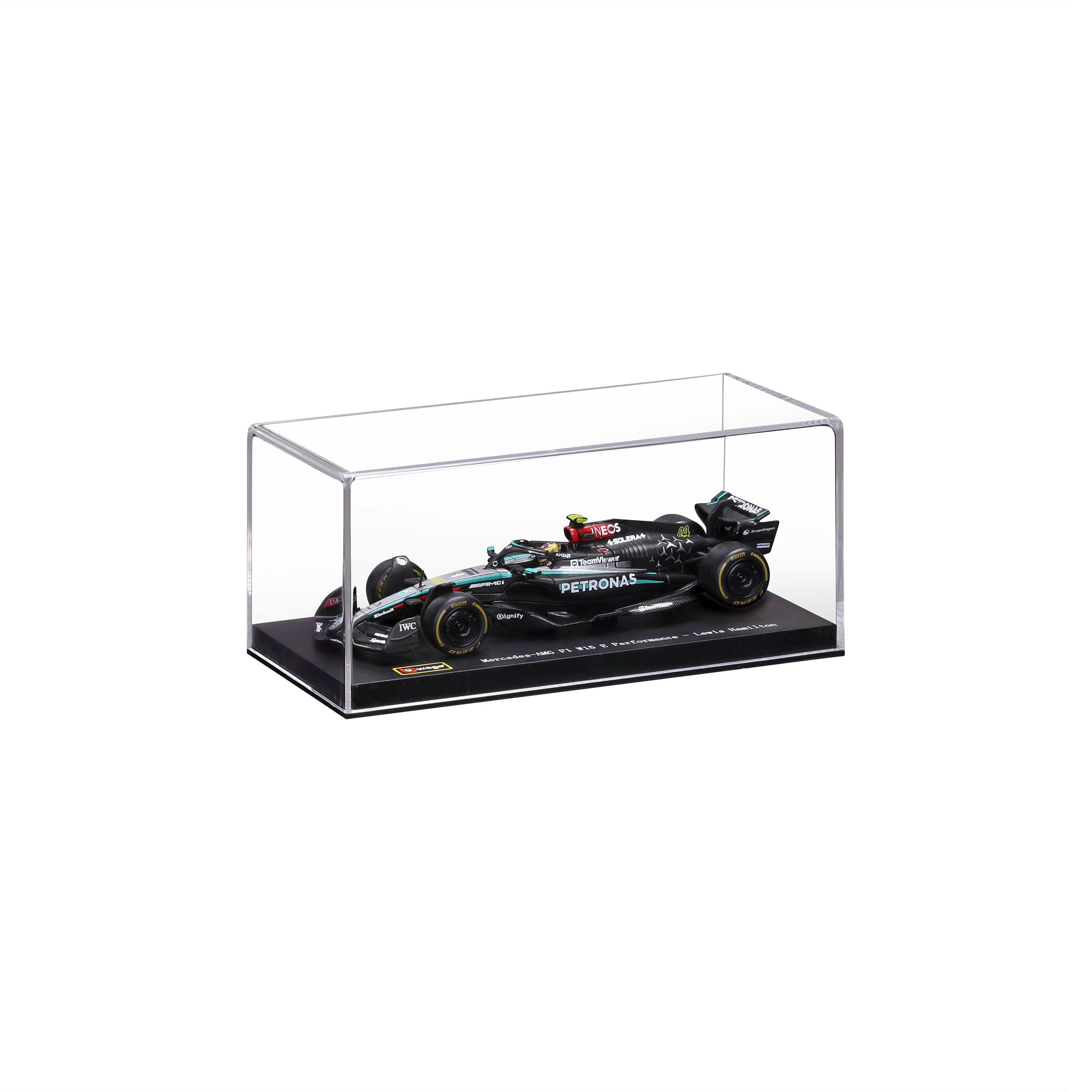 Das Modell wird in einer Acrylvitrine mit Sockel geliefert, die vor Staub schützt und die Präsentation hervorhebt. Dank der rollenden Räder lässt es sich leicht in der Vitrine oder auf dem Schreibtisch arrangieren. Ein tolles Geschenk für Fans von LEWIS HAMILTON und der modernen F1‑Ära.