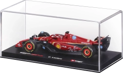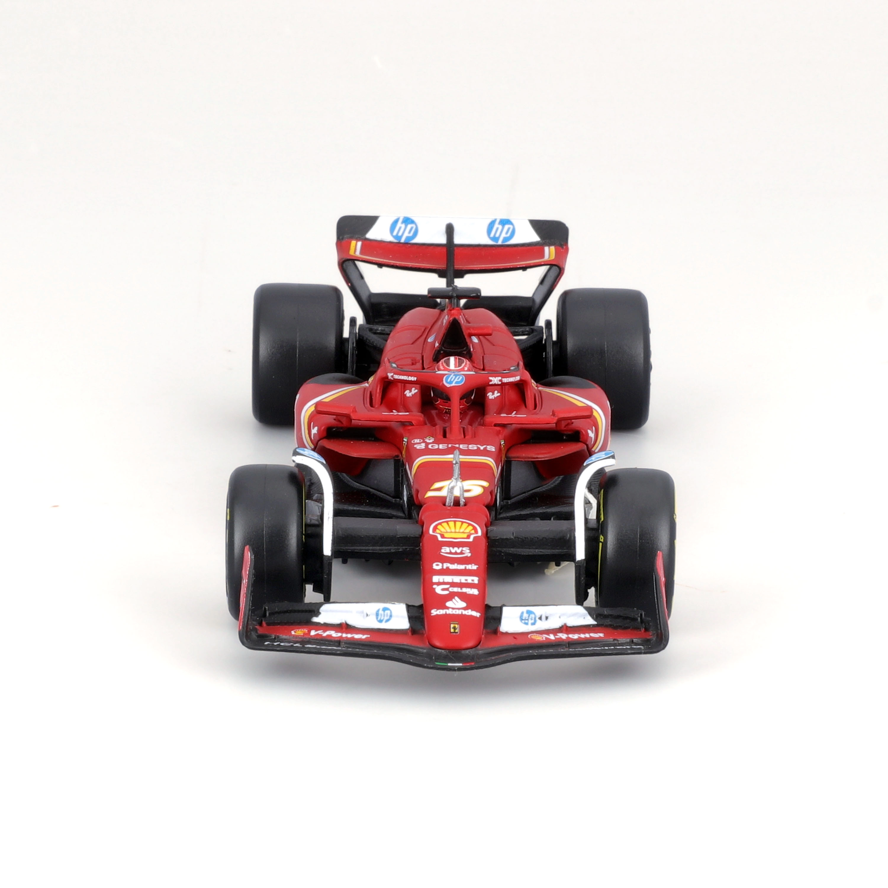 Dieses offiziell lizenzierte Modell Ferrari SF-24 (2024) von Bburago reproduziert die Formen des Monoposto originalgetreu, einschließlich Front- und Heckflügel, Halo und dem Rennlack mit Sponsorenlogos. Der Maßstab 1:43 ist ideal für Sammlerserien und eine kompakte Präsentation.