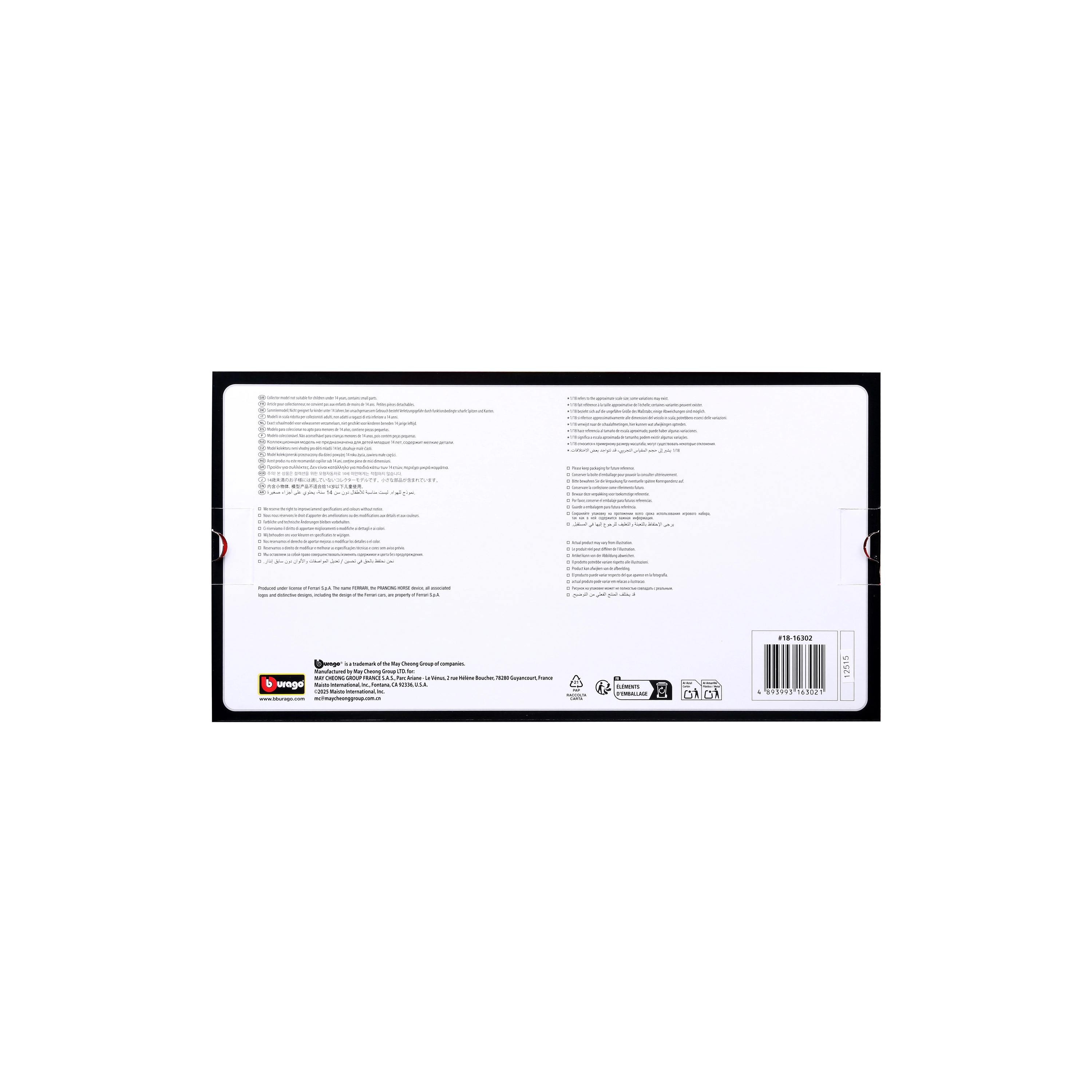 Die Karosserie überzeugt mit hochwertigen Details, scharfen Linien, präzisen Tampondrucken und funktionalen Elementen wie zu öffnenden Türen und drehbaren Rädern. Geliefert wird es in einer attraktiven Bburago-Geschenkverpackung mit Sichtfenster – ein großartiges Geschenk für Motorsport- und Ferrari-Fans.