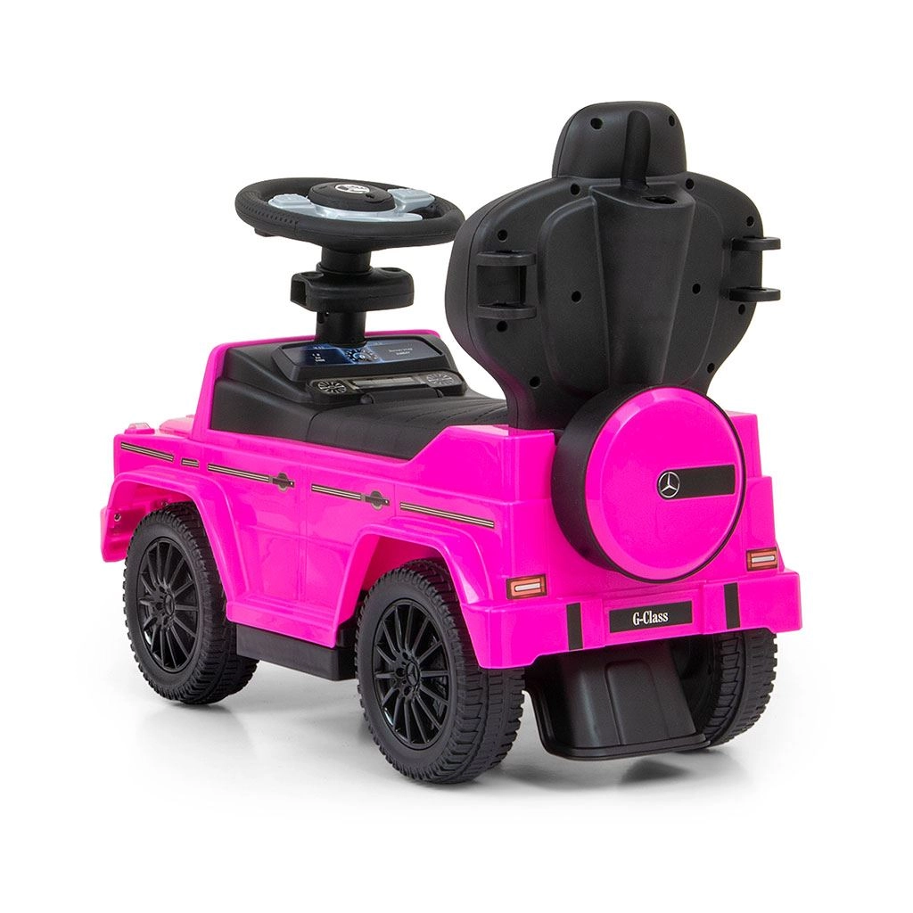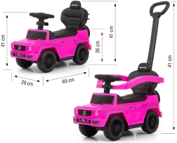 Das lizenzierte Rutscherfahrzeug MERCEDES G350d in Rosa sieht aus wie ein echter Geländewagen und motiviert Kinder zu aktiver Bewegung, trainiert Gleichgewicht und Motorik. Dank hoher Rückenlehne, seitlicher Armlehnen und Schiebestange eignet es sich für Kinder, die bereits sitzen können, aber auch für kleine Laufanfänger. Nach dem Entfernen der Schiebestange, der Armlehnen und der Fußstützen wird es zu einem klassischen Rutscher.
