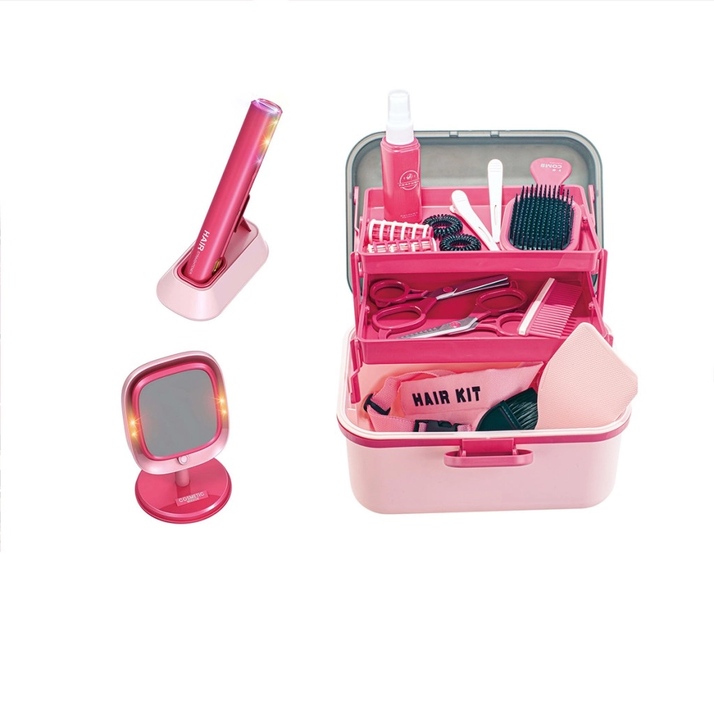 Verwandeln Sie das Kinderzimmer in ein kleines Friseurstudio. Dieses verspielte Set umfasst ein rosafarbenes Kinder-Haarglätteisen in einer praktischen Ladestation und einen stabilen Tischspiegel mit Lichtern, die eine professionelle Salonatmosphäre schaffen. Das gesamte Zubehör besteht aus leichtem Kunststoff und ist auf Kinderhände abgestimmt.