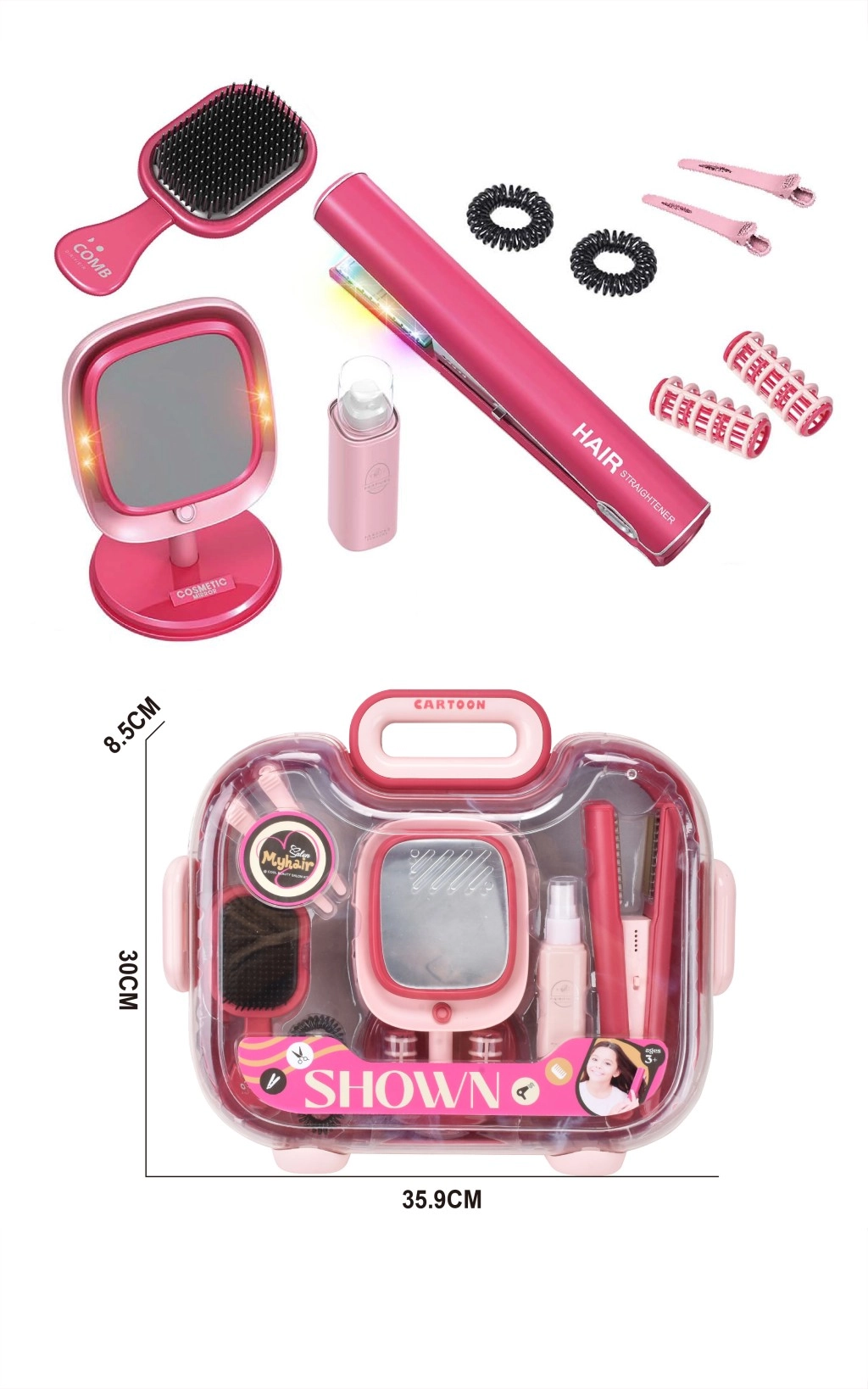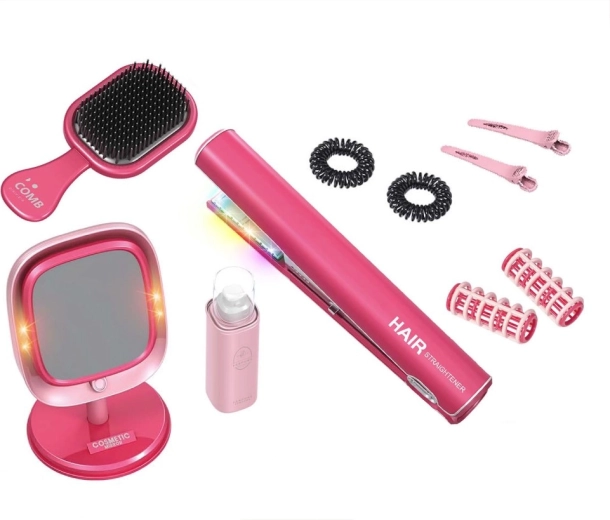 Dieses Spielset ist so gestaltet, dass es Kindern ein authentisches Friseurerlebnis bietet. Das Kinder-Haarglätteisen erzeugt Licht- und Geräuscheffekte, die ein professionelles Werkzeug realistisch nachahmen. Der Tischspiegel mit Standfuß ist mit LEDs rundum ausgestattet, sodass kleine Stylistinnen ihre Kreationen wie an einem echten Schminktisch betrachten können.