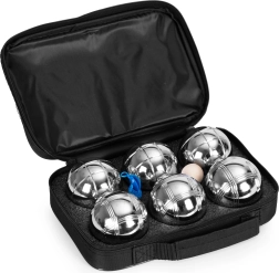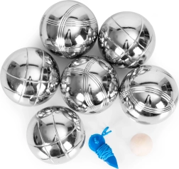 Das Set enthält 6 robuste Kugeln aus verchromtem Stahl mit einem Durchmesser von 72 mm und einem Gewicht von ca. 700 g für einen angenehmen und stabilen Wurf. Zwei verschiedene Riffelungsdesigns erleichtern die Unterscheidung der Kugeln im Spiel. Die hölzerne Cochonnette dient als Ziel, und die Messschnur hilft, strittige Situationen fair zu entscheiden.
