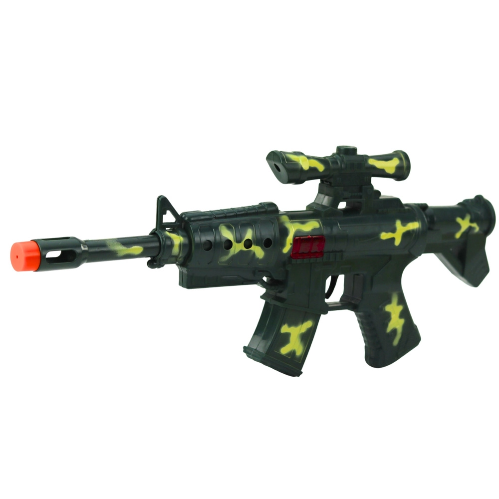 Beim Drücken des Abzugs ertönt ein markanter mechanischer Schusseffekt, der die Spielatmosphäre verstärkt. Die Kunststoffkonstruktion mit Tarn-Details ist leicht und sicher für Kinder.