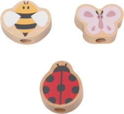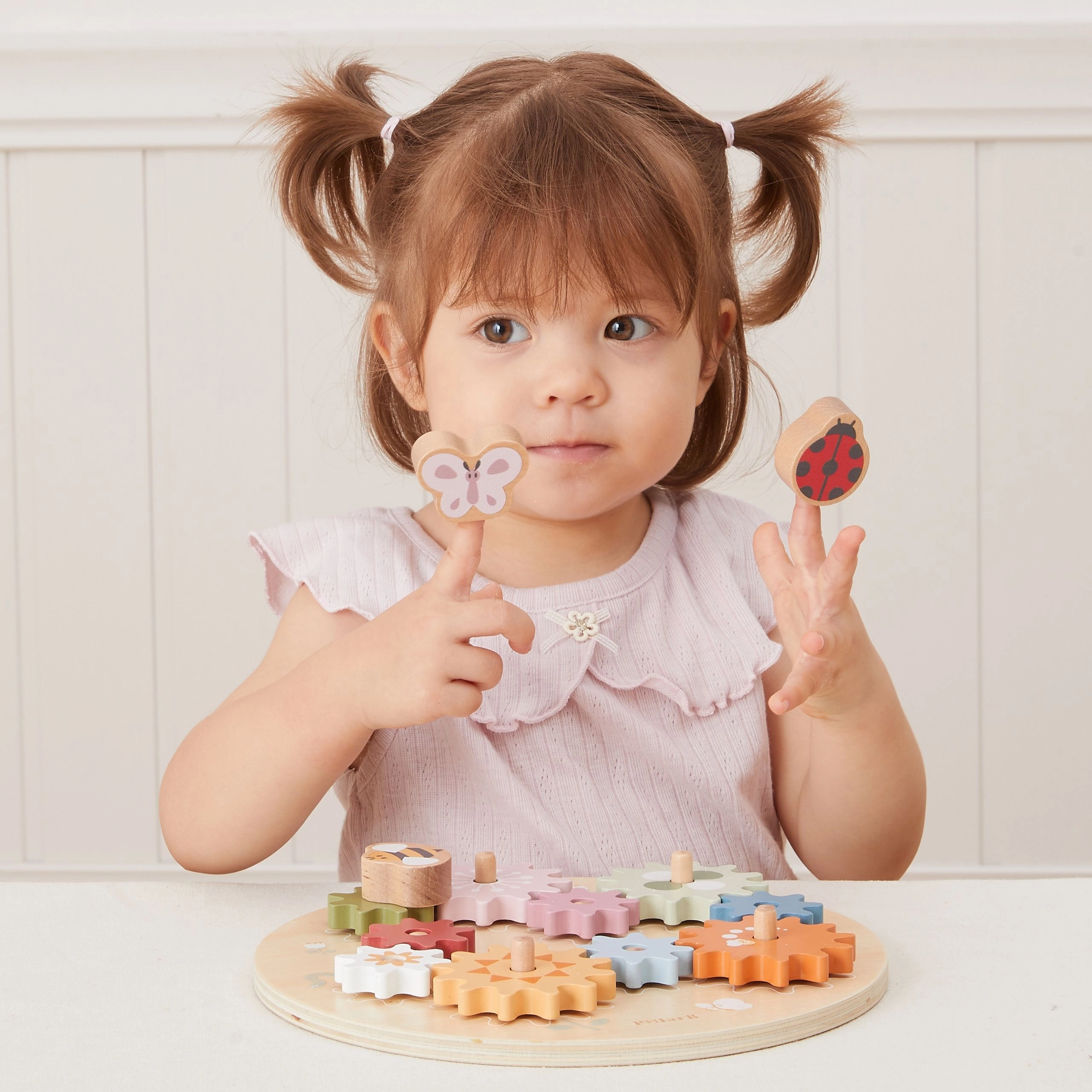 Dieses hochwertige Holzspielzeug ist für kleine Entdecker ab 18 Monaten konzipiert. Kinder setzen und verbinden die Zahnräder auf die Stifte, sodass sie ineinandergreifen und sich beim Drehen alle gleichzeitig bewegen. Sanfte Pastellfarben, Motive von Schmetterling, Marienkäfer und Biene sowie die glatte Verarbeitung laden zu sicherem und sinnvollem Spiel ein.
