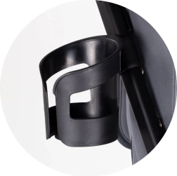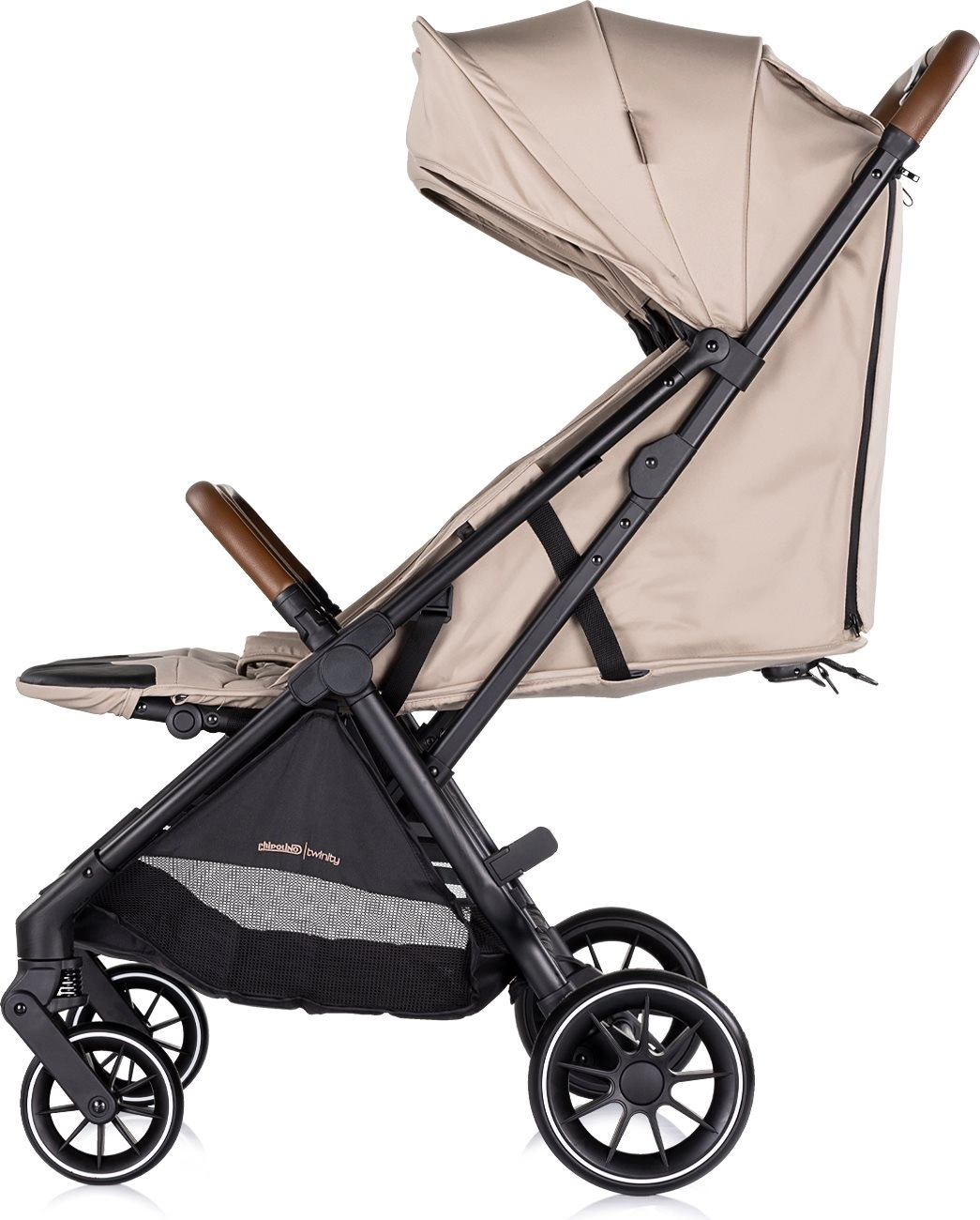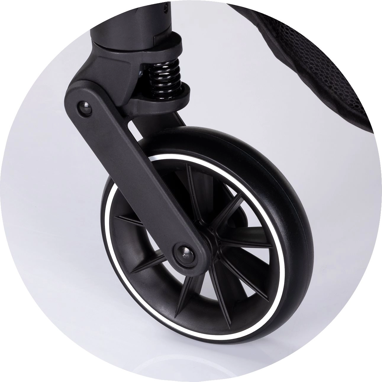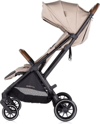 Für Sicherheit sorgen Fünfpunktgurte mit weicher Polsterung und abnehmbare Frontbügel mit Kunstlederbezug. Gefederte, leicht abnehmbare Räder und die Hinterradbremse gewährleisten eine stabile, sanfte Fahrt selbst im urbanen Gelände. Die praktische Ausstattung umfasst einen großen Stauraumkorb, gepolsterte Fußdecken, einen Getränkehalter sowie eine Tasche mit Wickelunterlage für schnelles Wickeln unterwegs.