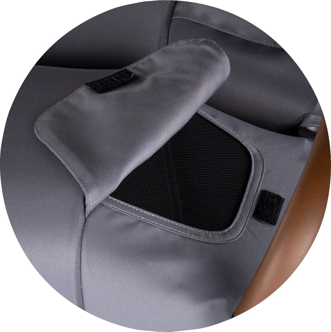 Separat verstellbare Rückenlehnen und Fußstützen, Fünfpunktgurte mit weicher Polsterung und abnehmbare Frontbügel aus Kunstleder.