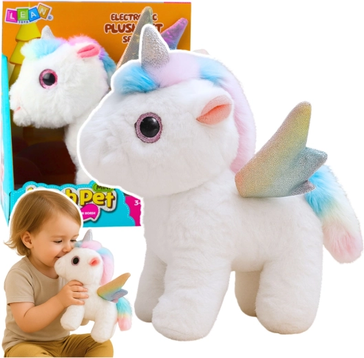 Das glänzende silberne Horn, die pastellfarbene Mähne und der Schweif sowie die regenbogenfarbenen Flügel verleihen dem Einhorn einen märchenhaften Charme, den Kinder lieben werden.