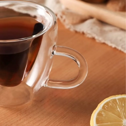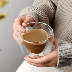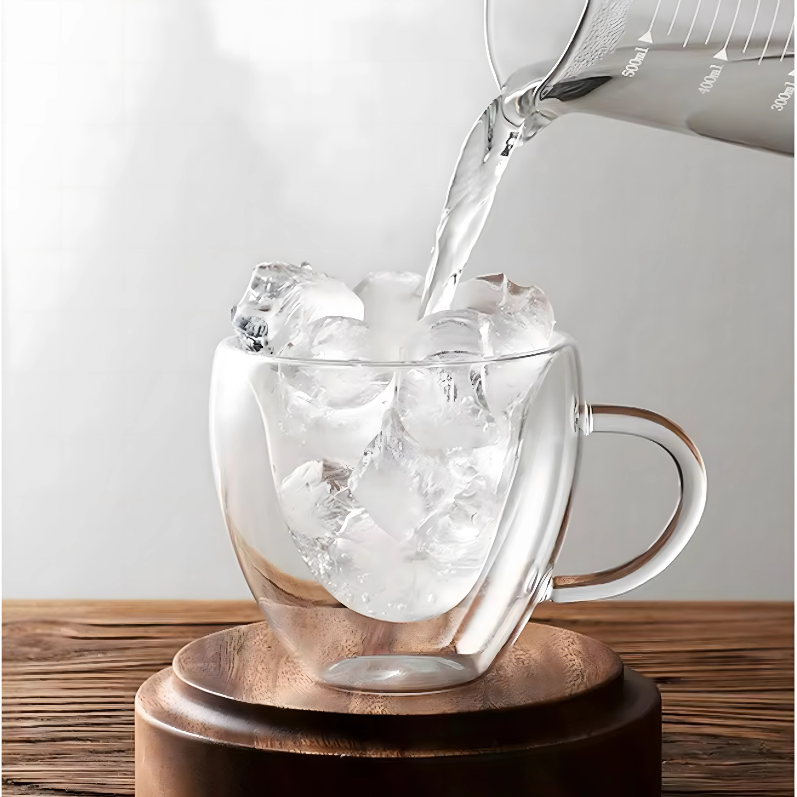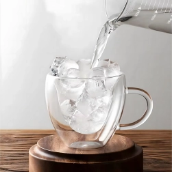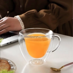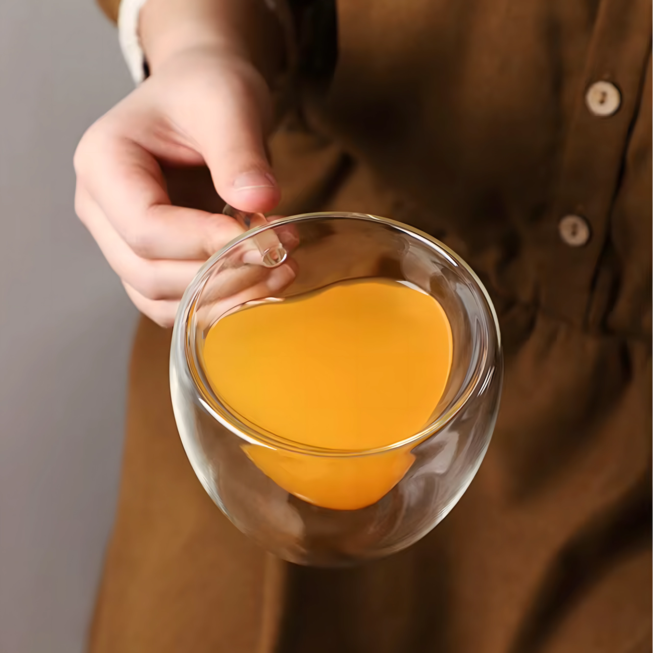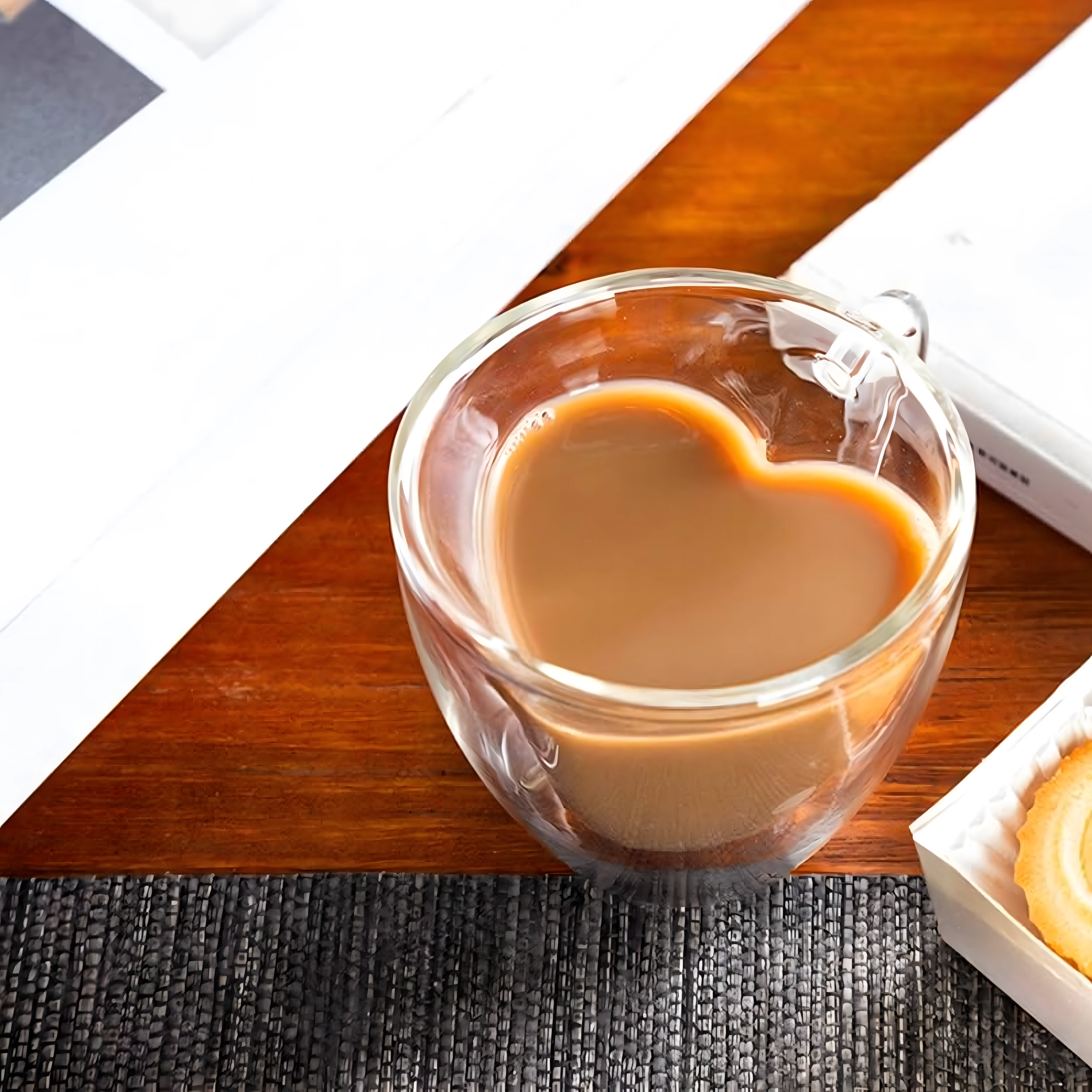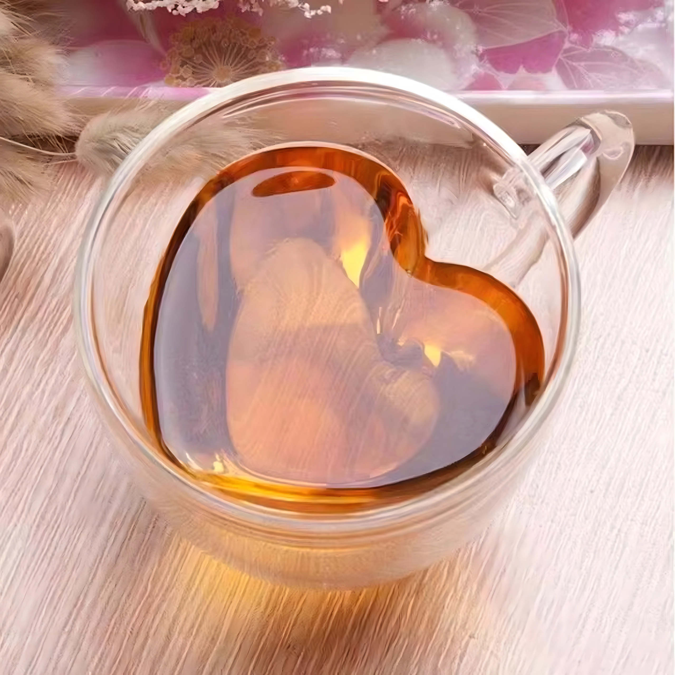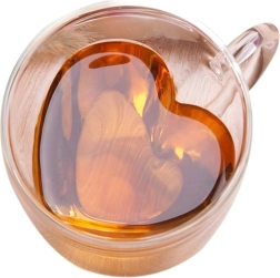 Eleganter Glasbecher in Herzform mit 250 ml Fassungsvermögen aus robustem Borosilikatglas mit Doppelwand für bessere Wärmeisolierung. Perfekt geeignet für heißen Kaffee, aromatischen Tee sowie kalte Getränke und Desserts. Dank der isolierenden Konstruktion bleibt die Temperatur des Getränks länger erhalten, während die Außenwand angenehm kühl bleibt und ein sicheres Halten ermöglicht.