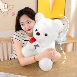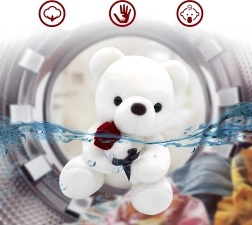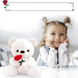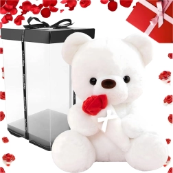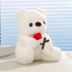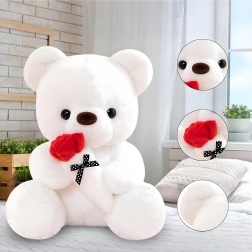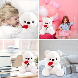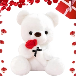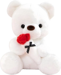 Dieser weiße Plüsch-Teddybär begeistert auf den ersten Blick durch seine Weichheit, das niedliche Design und die dekorative rote Rose, gebunden mit einem gepunkteten Band. Ideal als romantische Überraschung, aber auch als lieber Talisman fürs Kinderzimmer oder den Schreibtisch.
