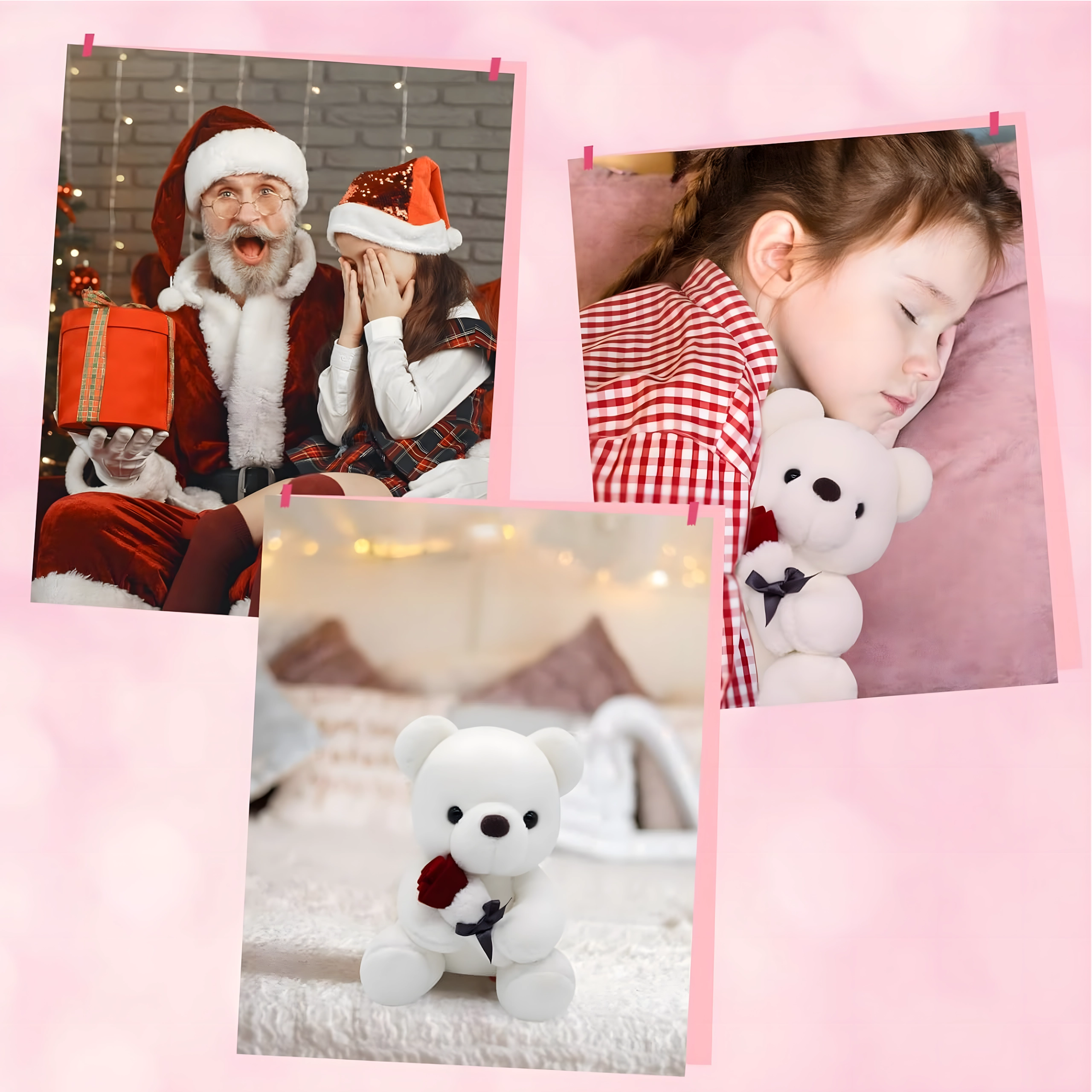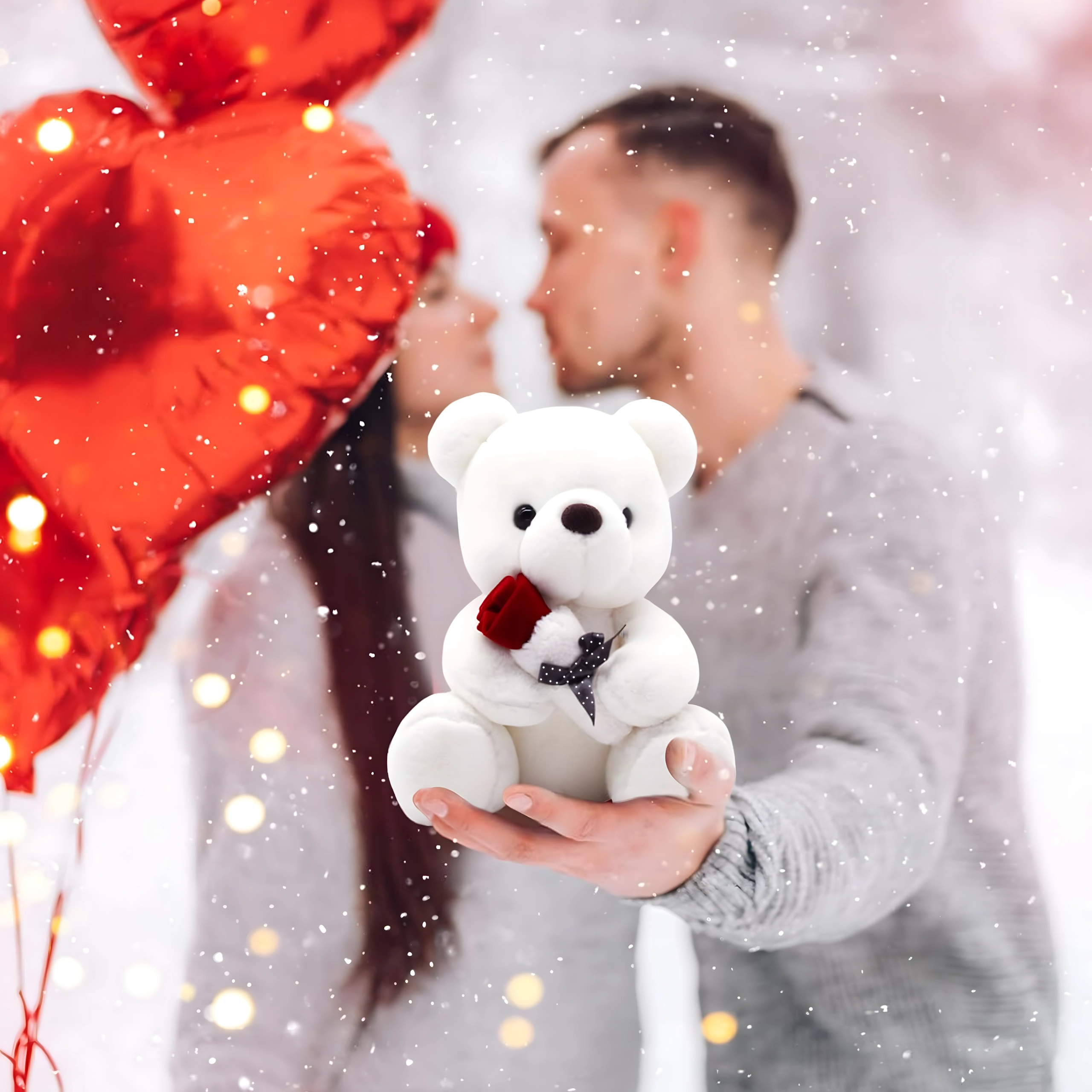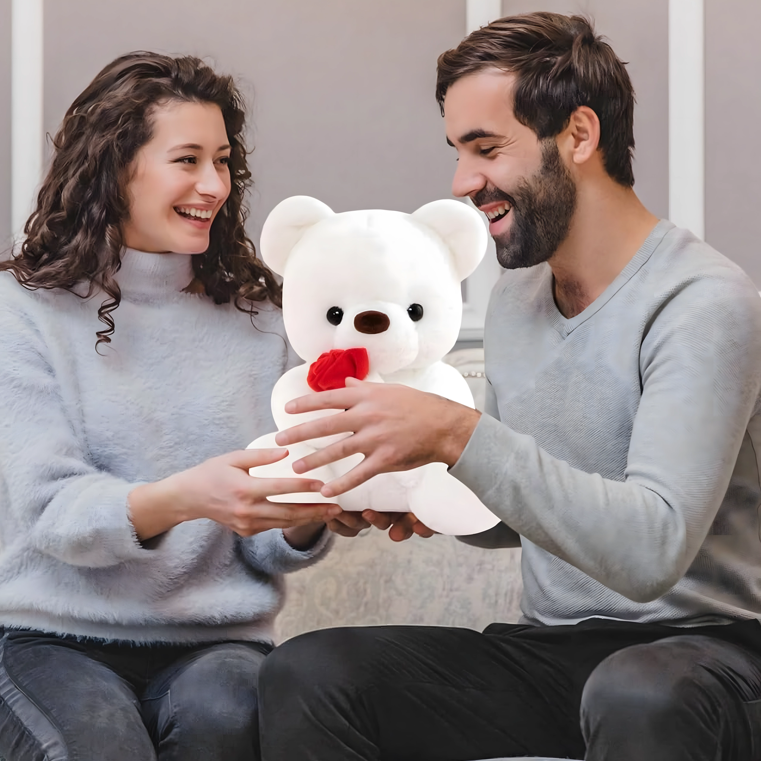 Die dekorative rote Rose mit gepunktetem Band verleiht dem Bären ein Symbol der Liebe und macht ihn zum perfekten Geschenk für Valentinstag, Jahrestage und Geburtstage.