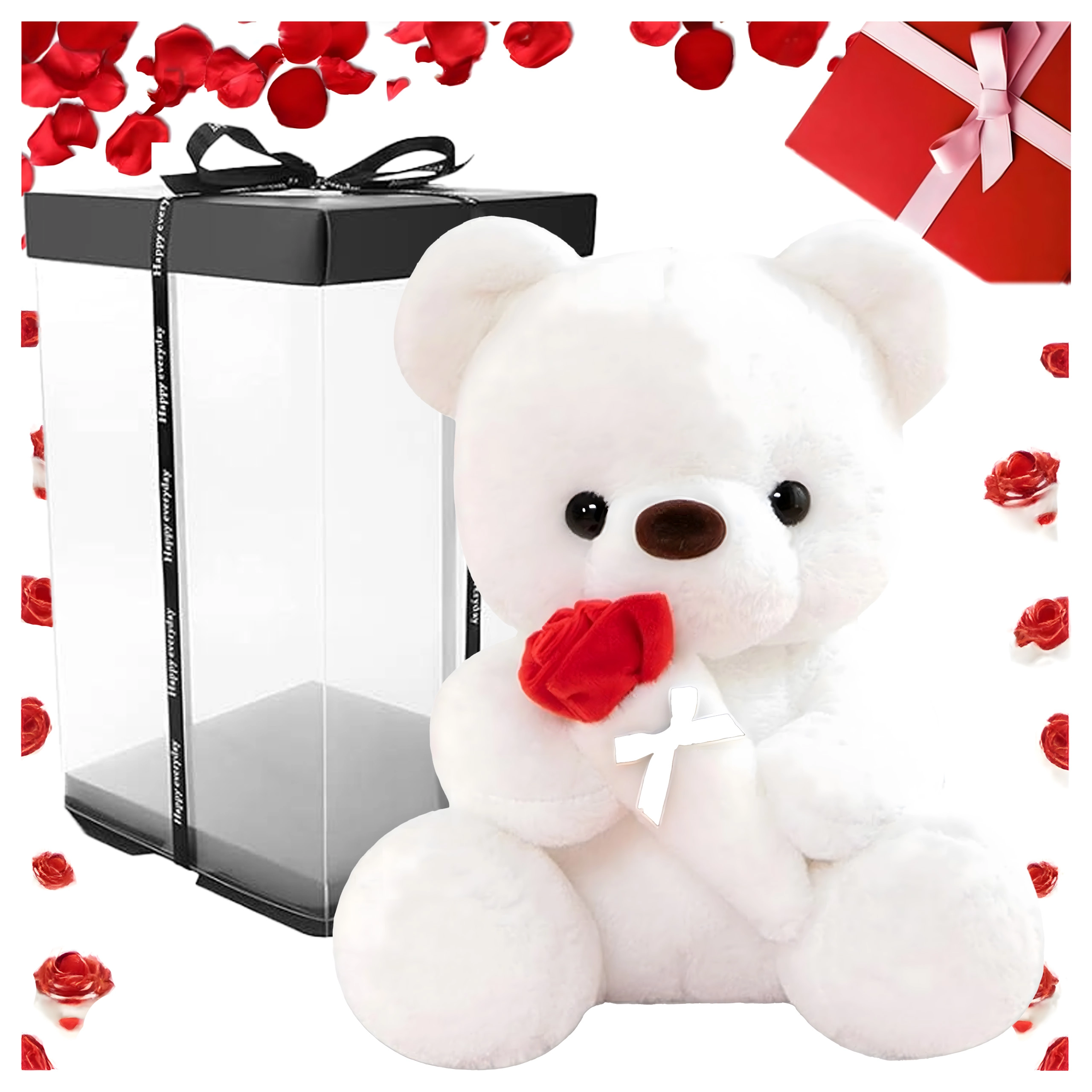Niedlicher und weicher Plüsch-Teddybär mit einer Höhe von 32 cm, mit einer roten Rose und einer eleganten Punkt-Schleife – das perfekte Liebesgeschenk für Geburtstage, Jahrestage, Valentinstag und Weltfrauentag. Das sanfte Material lädt zum Kuscheln ein und der niedliche Ausdruck begeistert Klein und Groß.