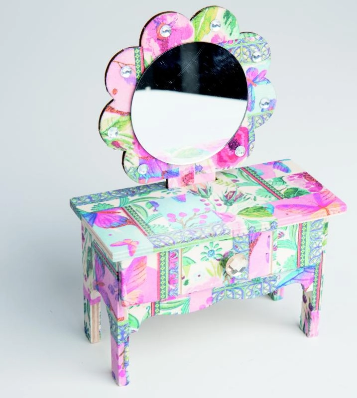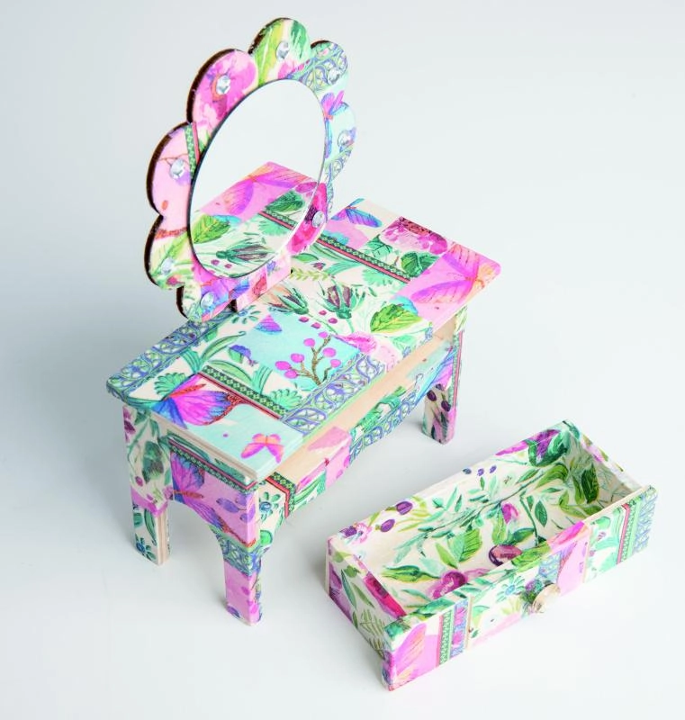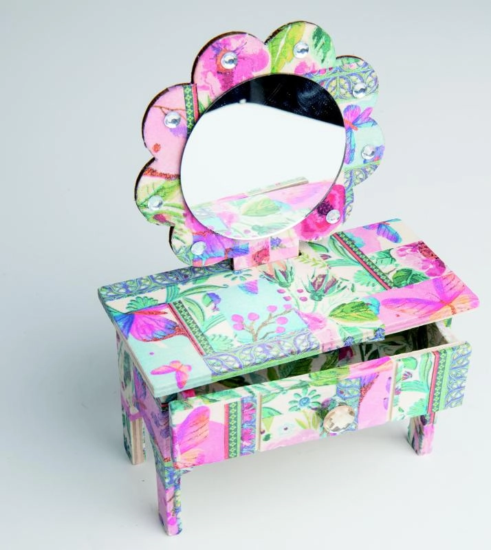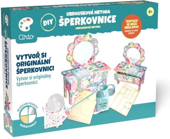 Setzen Sie ein stilvolles Schmuckkästchen in Form eines kleinen Schminktischs zusammen und verzieren Sie es mit der beliebten Serviettentechnik. Das ARTO-Set bietet einen einfachen Ablauf von der Montage bis zur finalen Dekoration, sodass Sie sowohl die Freude am Gestalten als auch ein schönes Ergebnis genießen.