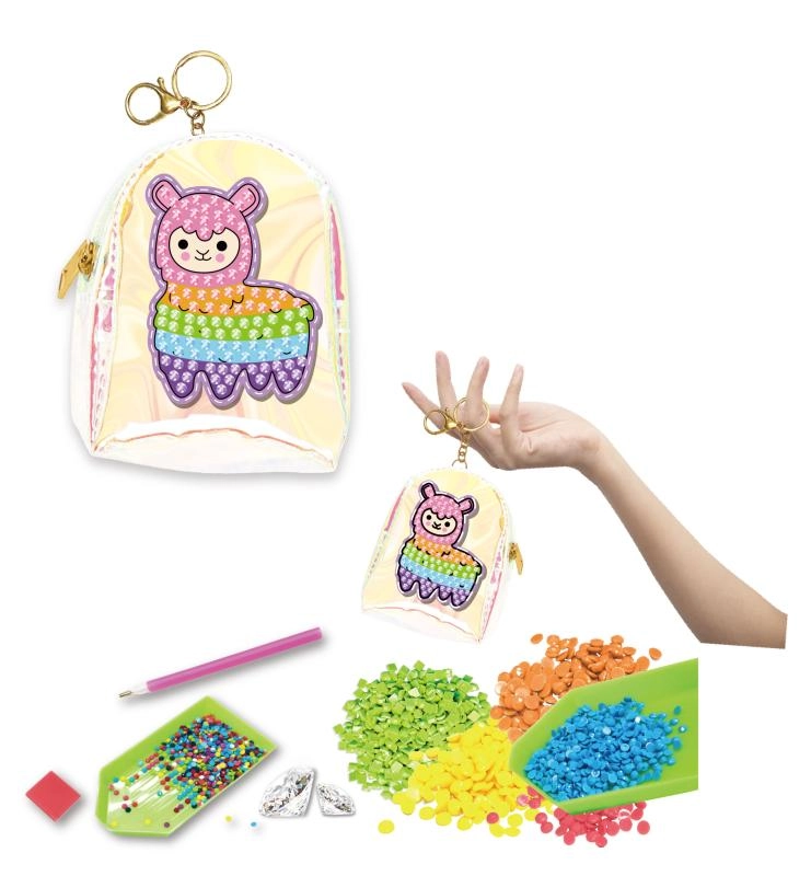 Einfach den Sticker auf den Mini-Rucksack-Anhänger kleben, mit bunten Steinchen ergänzen und ein einzigartiges, funkelndes Stück gestalten, das alle Blicke auf sich zieht.