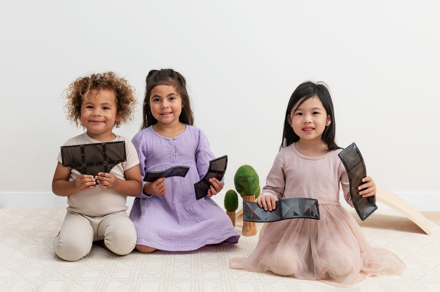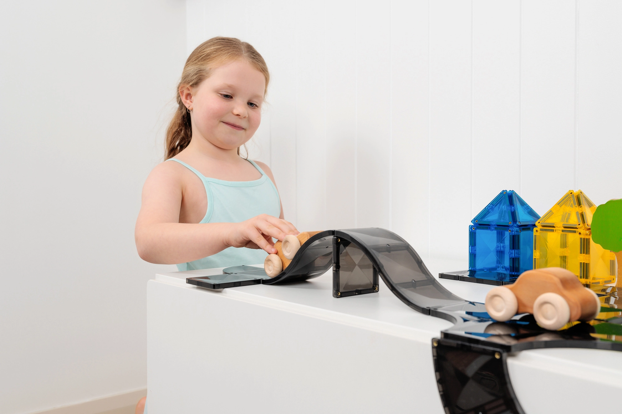 Das Connetix Roads Creative Pack bietet transparente, robuste Straßenteile in elegantem Dunkelton, die dank starker Neodym-Magnete nahtlos zusammenpassen. Kinder bauen Rampen, Kurven, Kreuzungen und Brücken und können darauf mit Holzautos fahren. Beim Spielen trainieren sie ganz natürlich logisches Denken, Motorik sowie Grundlagen der Physik und Geometrie.