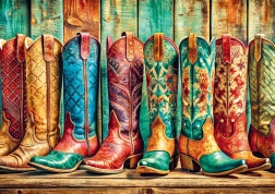 Dieses Motiv ist eine hervorragende Wahl für Liebhaber von Design, Mode und Western-Ästhetik. Das fertige Puzzle mit den Maßen 68 × 48 cm eignet sich ideal zum Einrahmen und zur Wohnraumdekoration.