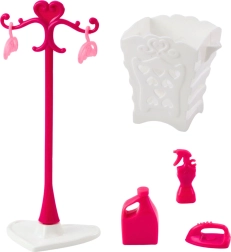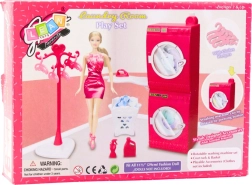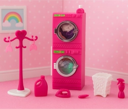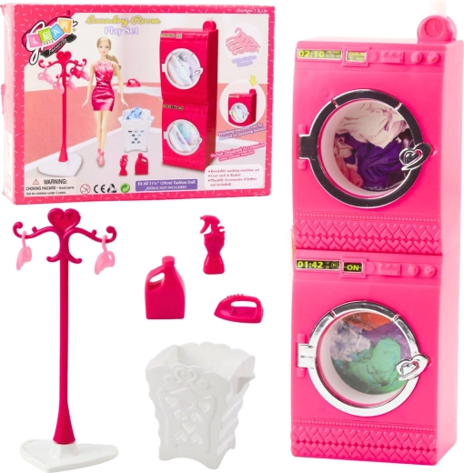 Rosa Waschküche für Puppen – Waschmaschine, Trockner, Kleiderständer und Korb