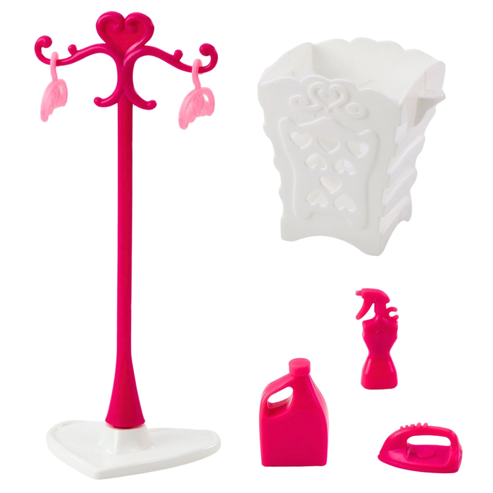 Die stilvolle rosa Waschküche für Puppen mit einer Größe von ca. 29 cm bietet realitätsnahe Haushaltsspielideen. Enthalten sind eine Waschmaschine mit drehender Trommel, ein Trockner, ein Standkleiderständer mit Kleiderbügeln, ein Wäschekorb sowie Accessoires wie „Waschmittel“ und ein Bügeleisen. Fördert Kreativität, Feinmotorik und Rollenspiel.