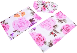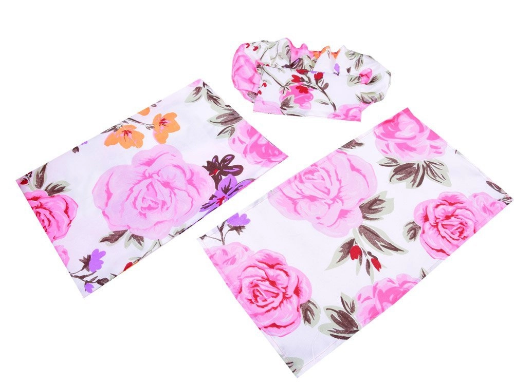 Dazugehörig sind ein weiches Kissen und eine Decke mit buntem Blumenmuster – alles aufeinander abgestimmt und bereit für Puppen und Kuscheltiere.