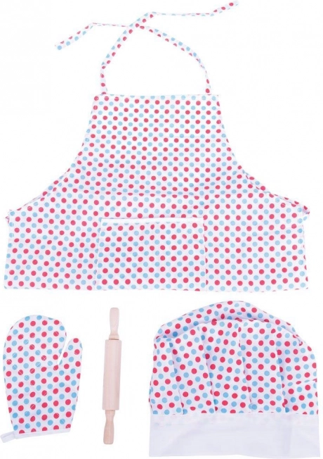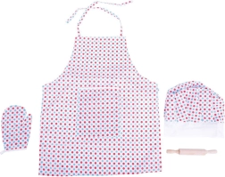 Gönnen Sie kleinen Köchinnen und Köchen alles, was sie für das erste Backen und fürs spielerische Kochen brauchen. Die leichte Textilschürze mit Punkten schützt die Kleidung, die Kochmütze lässt sich dank Klettverschluss leicht anpassen und das hölzerne Nudelholz mit Metall-Ausstechformen beflügelt Kreativität und die Freude am Gestalten.