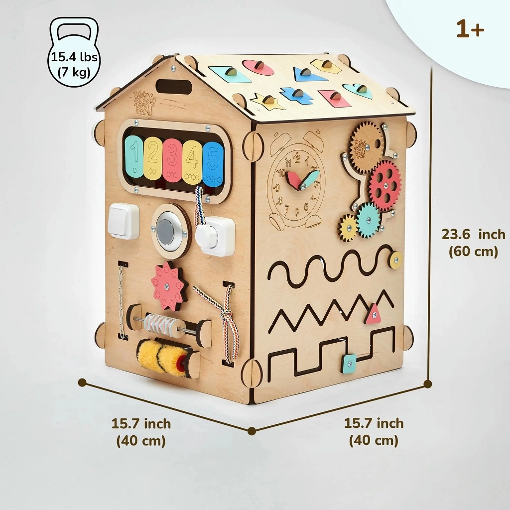 Entdecken Sie das Montessori Aktivhaus von BusyKids in naturbelassener Ausführung – ein robustes, umweltfreundliches und handgefertigtes Spielzeug, das die Feinmotorik, Kreativität und das logische Denken von Kindern fördert. Es bietet zahlreiche interaktive Elemente (Reißverschlüsse, Klettverschluss, Knöpfe, Wecker, Puzzle, Tafel) und ist geeignet für Kinder ab 1 Jahr. Hergestellt aus hochwertigem Birken-Sperrholz mit sicheren, wasserbasierten Lacken, schraubenloser Konstruktion, genieteten Verbindungen und CE- sowie EN 71-Zertifizierung.
