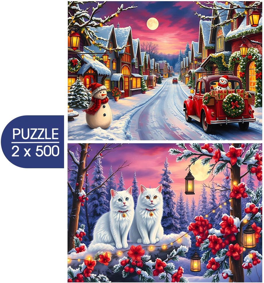 Entdecken Sie den Zauber von Weihnachten mit dem BLUEBIRD-Puzzle-Doppelpack, das zwei wunderschöne Winterillustrationen mit je 500 Teilen enthält. Jedes fertige Bild hat die Maße von ungefähr 47,8 × 34,2 cm und eignet sich daher ideal zum Einrahmen oder als Deko für Ihr Zuhause.