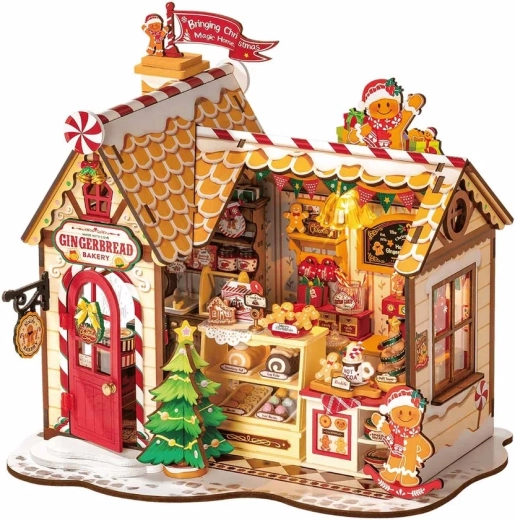 Dieses detailreich gestaltete 3D-Holzpuzzle eines Lebkuchenhäuschens bringt festliche Stimmung in jedes Zuhause. Ein mattes Dach mit Zuckerstangen, eine rote Tür, Auslagen voller Leckereien und das gemütliche warmweiße LED-Licht ergeben eine einzigartige Miniatur – ideal fürs Regal oder Fenster. Der Aufbau erfordert weder Klebstoff noch Werkzeuge – die Teile greifen passgenau ineinander und das fertige Modell ist stabil.