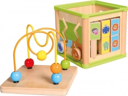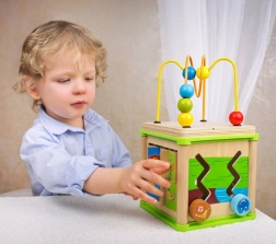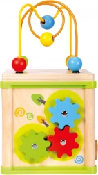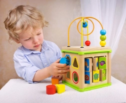 Dieser multifunktionale Motorikwürfel vereint fünf beliebte Aktivitäten: Formeinlage, Zahnrad-Getriebe, Zickzack-Führungen mit verschiebbaren Elementen, Zuordnung von Tieren zu ihrem Futter und das obere Perlenlabyrinth. Jede Seite des Würfels ist darauf ausgelegt, Hand-Auge-Koordination, Geduld und Konzentration zu fördern.