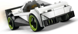 Flaches Profil, schwarz-weiße Lackierung und neongrüne Felgen. Das aufklappbare Cockpit ermöglicht es, eine Minifigur hineinzusetzen und auf die Strecke zu gehen.