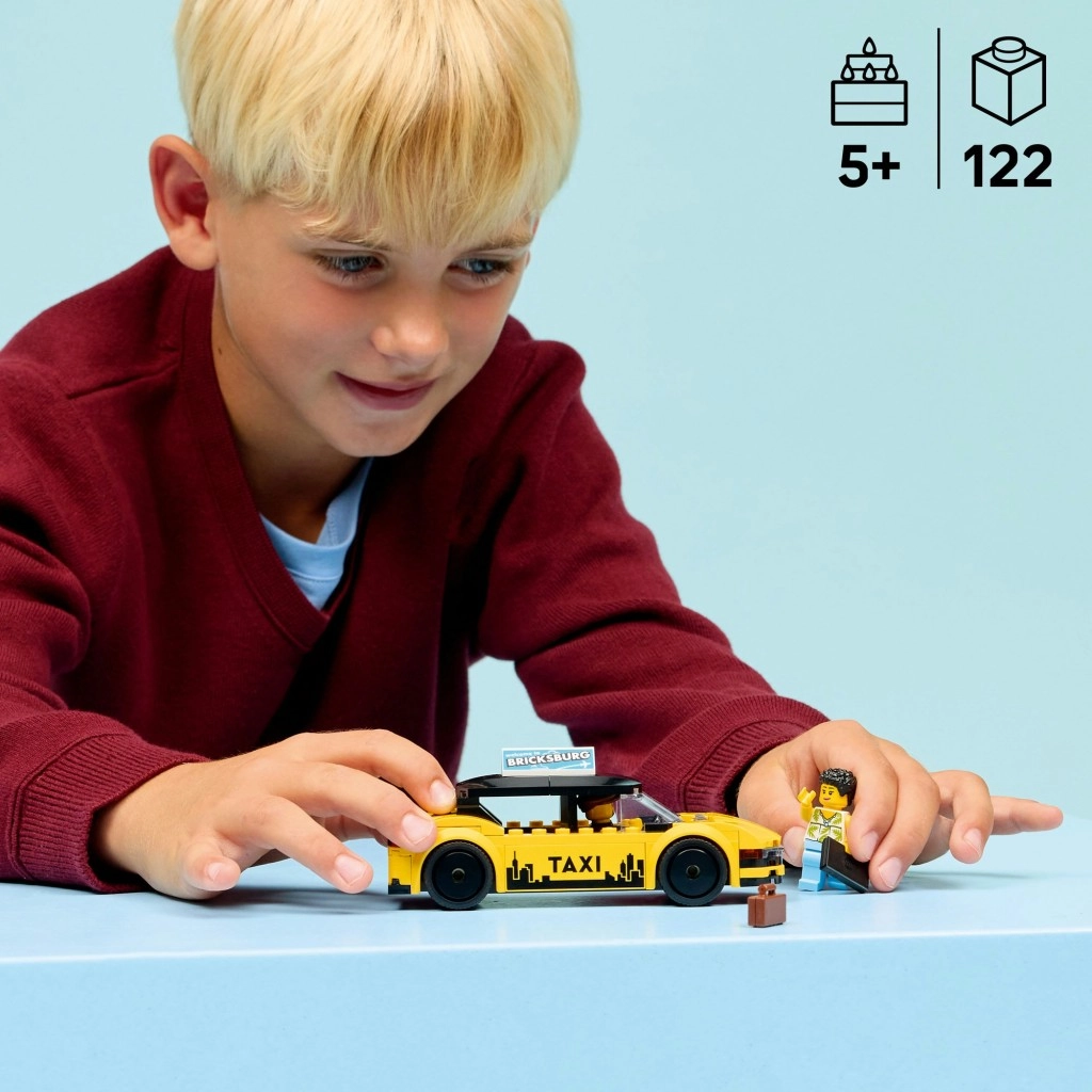 Gelbe Farbgebung mit schwarzen Streifen, der Aufschrift TAXI und einem Werbepanel „Welcome to Bricksburg“ verleihen dem Modell in jeder LEGO City Szene einen realistischen Look.