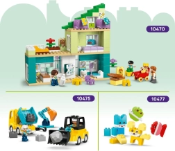 Große, leicht greifbare Steine und Zubehör, zwei Bauarbeiterfiguren und viele Geschichten für sicheres Spielen ab 3 Jahren.