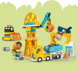 Dieses farbenfrohe Bauset bringt Kindern die echte Baustellenwelt näher – vom hohen Kran mit drehbarem Ausleger und funktionierendem Greifer über den Betonmischer mit rotierender Trommel bis hin zum Bulldozer und Kipplaster mit beweglichen Teilen. Zwei Bauarbeiterfiguren mit Werkzeugen fördern Rollenspiel und realistische Szenarien.