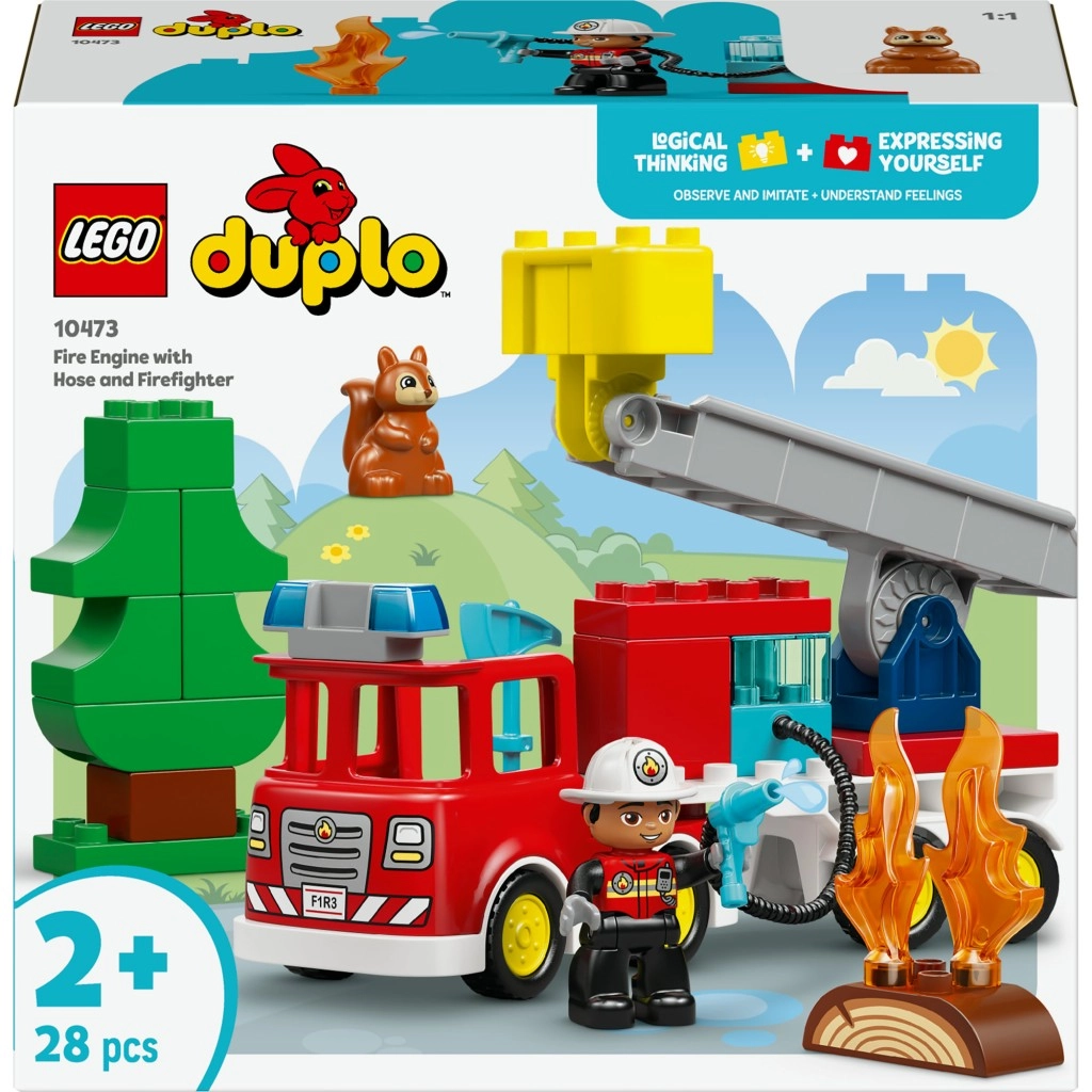 Das LEGO DUPLO Feuerwehrauto bietet Kindern gut greifbare Teile, kräftige Farben und viele realistische Details – von einem transparenten Wassertank bis zum Gelenk-Anhänger für einfaches Manövrieren. Die verstellbare Leiter mit Korb ermöglicht es kleinen Feuerwehrleuten, das niedliche Eichhörnchen sicher vom Baum zu „retten“.