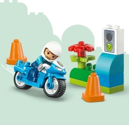 Entdecken Sie das unterhaltsame und lehrreiche LEGO DUPLO Set für die Kleinsten: das blaue Polizeimotorrad mit Polizistin, Verkehrskegeln und einfachem Zubehör für das Spielen auf der Straße. Die großen Steine sind sicher und leicht zu greifen, fördern die Feinmotorik, die Kreativität und das Lernen der Verkehrsregeln spielerisch.