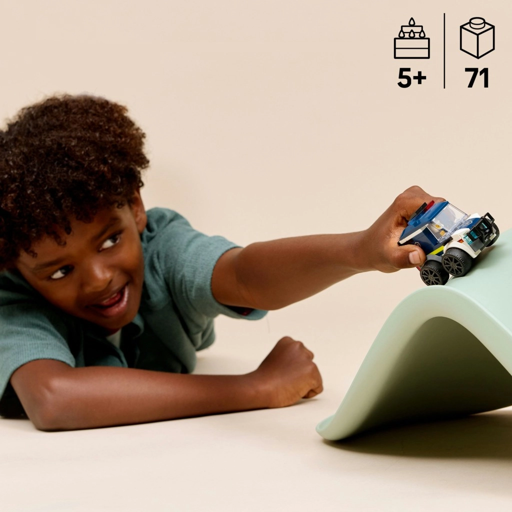 Erlebt actionreiche Verfolgungsjagden mit dem LEGO City Autos – Polizeivan. Das Set mit 71 Teilen für Kinder ab 5 Jahren bietet einfaches Bauen, eine robuste Konstruktion und ein authentisches Polizeidesign mit großen Rädern, Warnlichtern und Platz für eine Polizist-Minifigur. Eine tolle Wahl für kreatives Spielen zu Hause und unterwegs, kompatibel mit der LEGO Builder App.