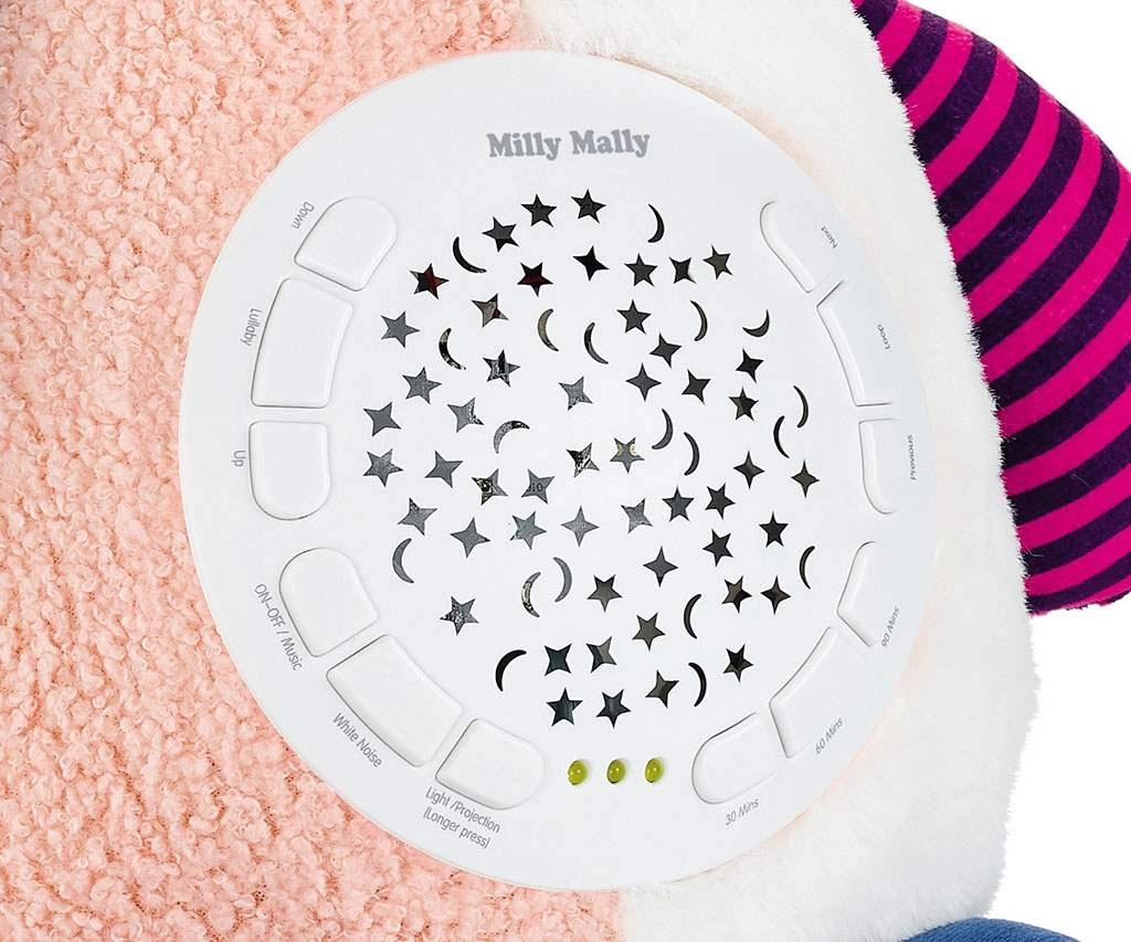 Sie stellen bequem den Timer auf 30, 60 oder 90 Minuten sowie die Lautstärke in 5 Stufen ein. Das abnehmbare Projektormodul ermöglicht das Waschen des Spielzeugs und die getrennte Nutzung von Licht und Ton. Geeignet ab Geburt, entspricht Sicherheitsnormen.