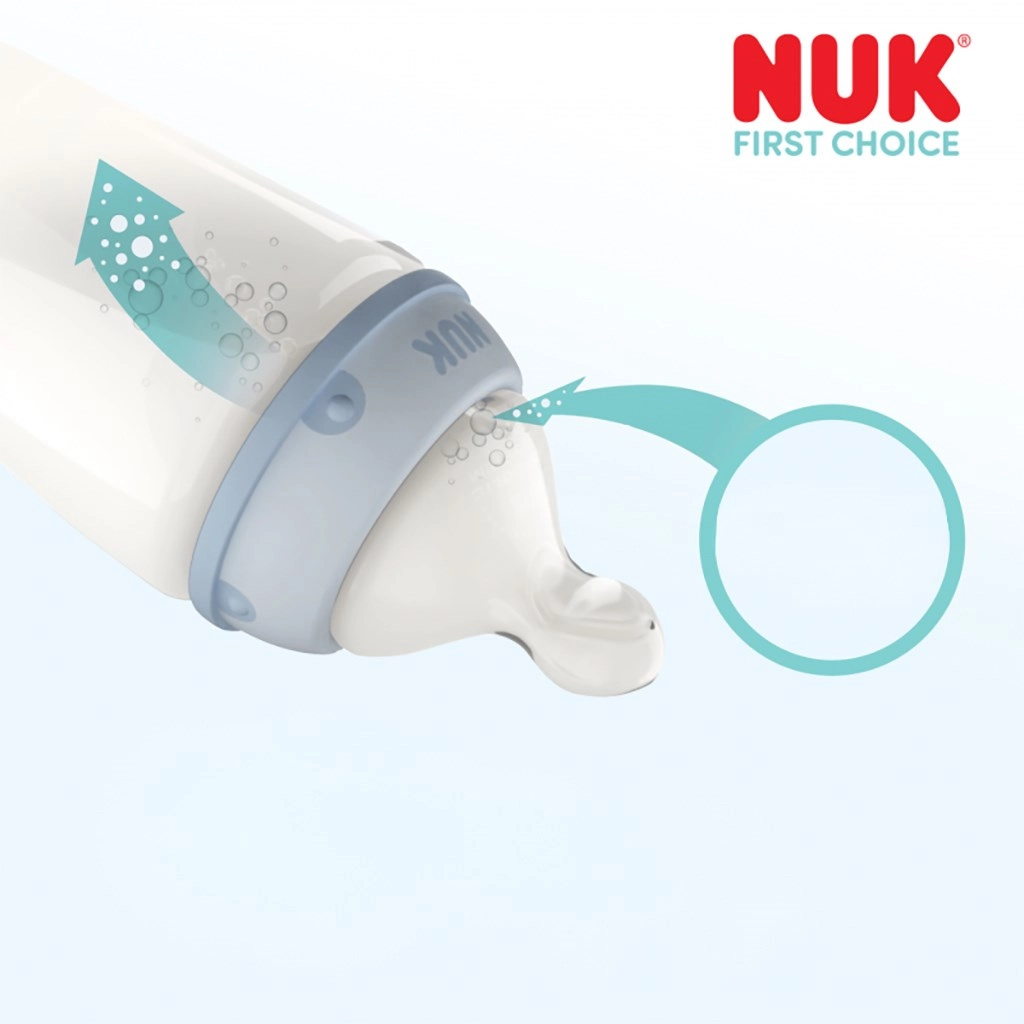 Der Sauger NUK First Choice+ Flow Control ist so konzipiert, dass er sich dem Trinktempo Ihres Babys anpasst. Die innovative Y-förmige Öffnung öffnet sich nur beim Saugen und ihre Breite variiert je nach Intensität, sodass die Flüssigkeit genau so schnell fließt, wie das Kind es benötigt – egal ob das Getränk dünn- oder dickflüssiger ist. Integriert ist ein zuverlässiges Antikolik-System, das das Luftschlucken minimiert und zu einem entspannten Bäuchlein beiträgt.